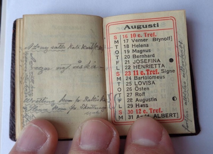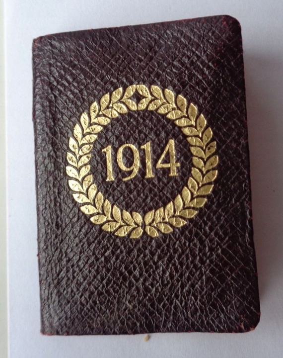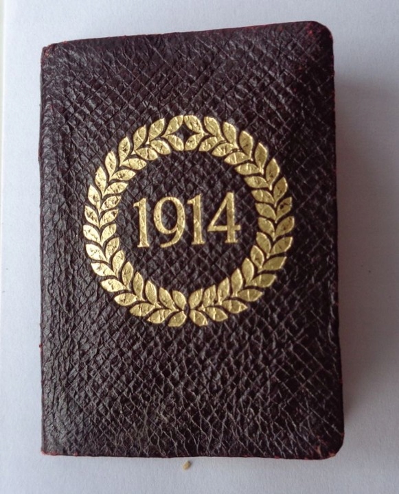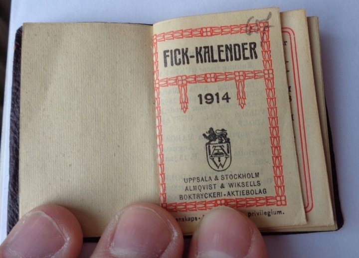 Красивый, элегантный, полный карманный календарь в стиле модерн 1914 года. Экспонат имеет красиво выполненную коричневую обложку. В центральной части помещена дата, окруженная красиво выполненным венком. Дата и венок были окрашены золотом. Экземпляр изготовлен в стокгольмском издательстве. Имеет красиво оформленный титульный лист с орнаментом в стиле модерн. Края страниц позолочены. Рекомендую коллекционерам.
