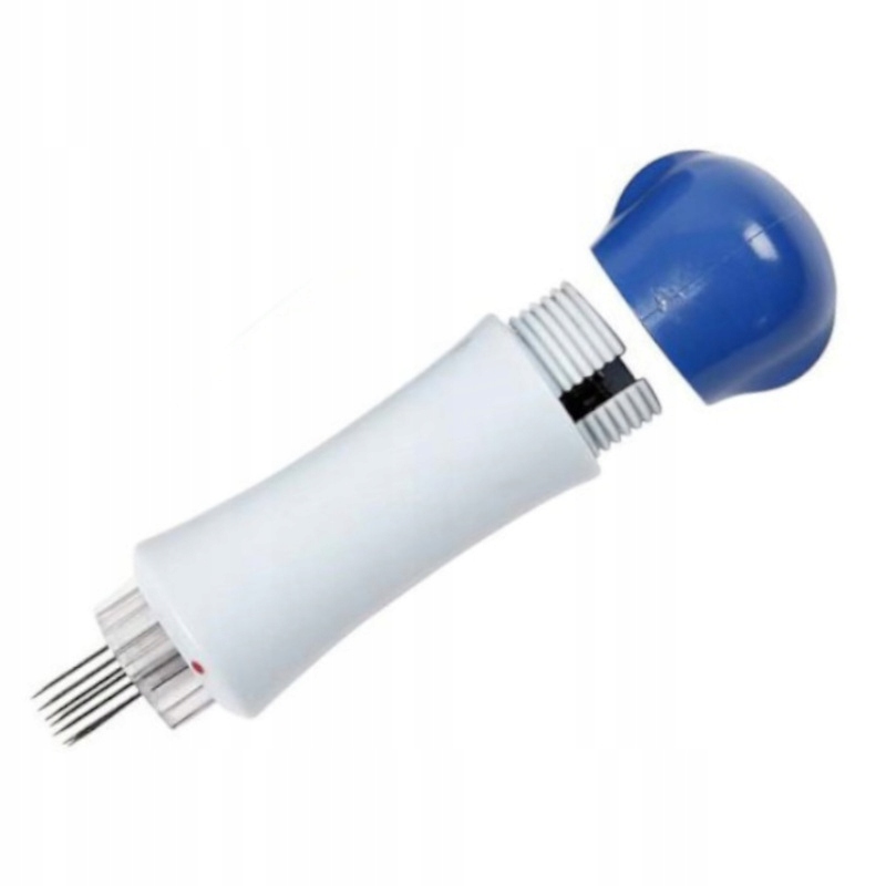 Это устройство для валяния, оснащенное 7 толстыми иглами. Устройство можно использовать для сухого и мокрого валяния. Иглы можно легко и быстро заменить – достаточно открутить синюю часть устройства и заменить иглы. Устройство рассчитано на удержание игл любой толщины. Замок в нижней части устройства предохраняет иглы от поломки при транспортировке, а также защищает пользователя от уколов до и после работы.