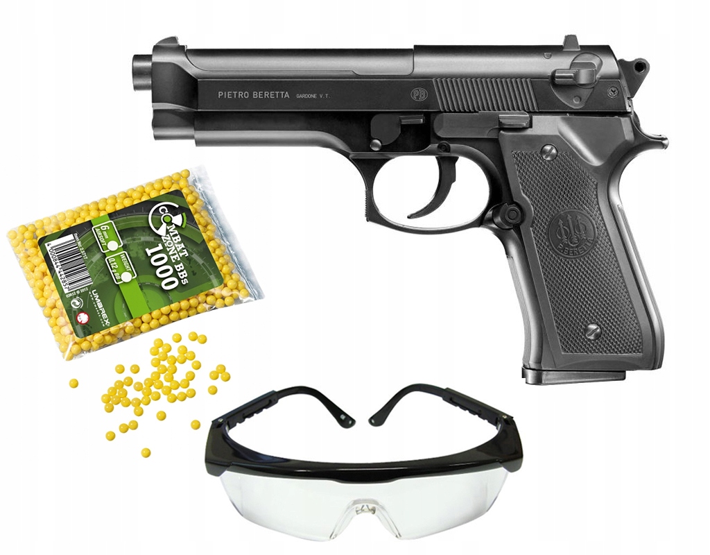 Реплика страйкбольного пистолета Beretta M92 FS 6 мм Hop-Up, 220 выстр., металлический затвор, магазин на 12 шаров + 1000 шаров 0,12 г + защитные очки