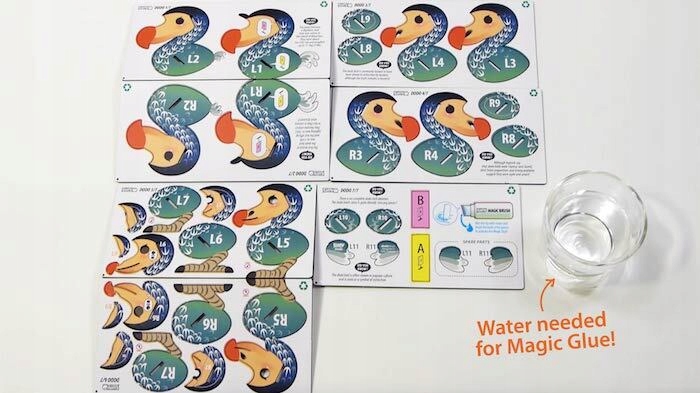 Чтобы уменьшить содержание пластика, в последней модели Eugy нет пластиковой бутылки с клеем! Волшебный клей уже нанесен на обратную сторону каждой детали, которую можно активировать, только если закрасить его водой с помощью Волшебной кисти.