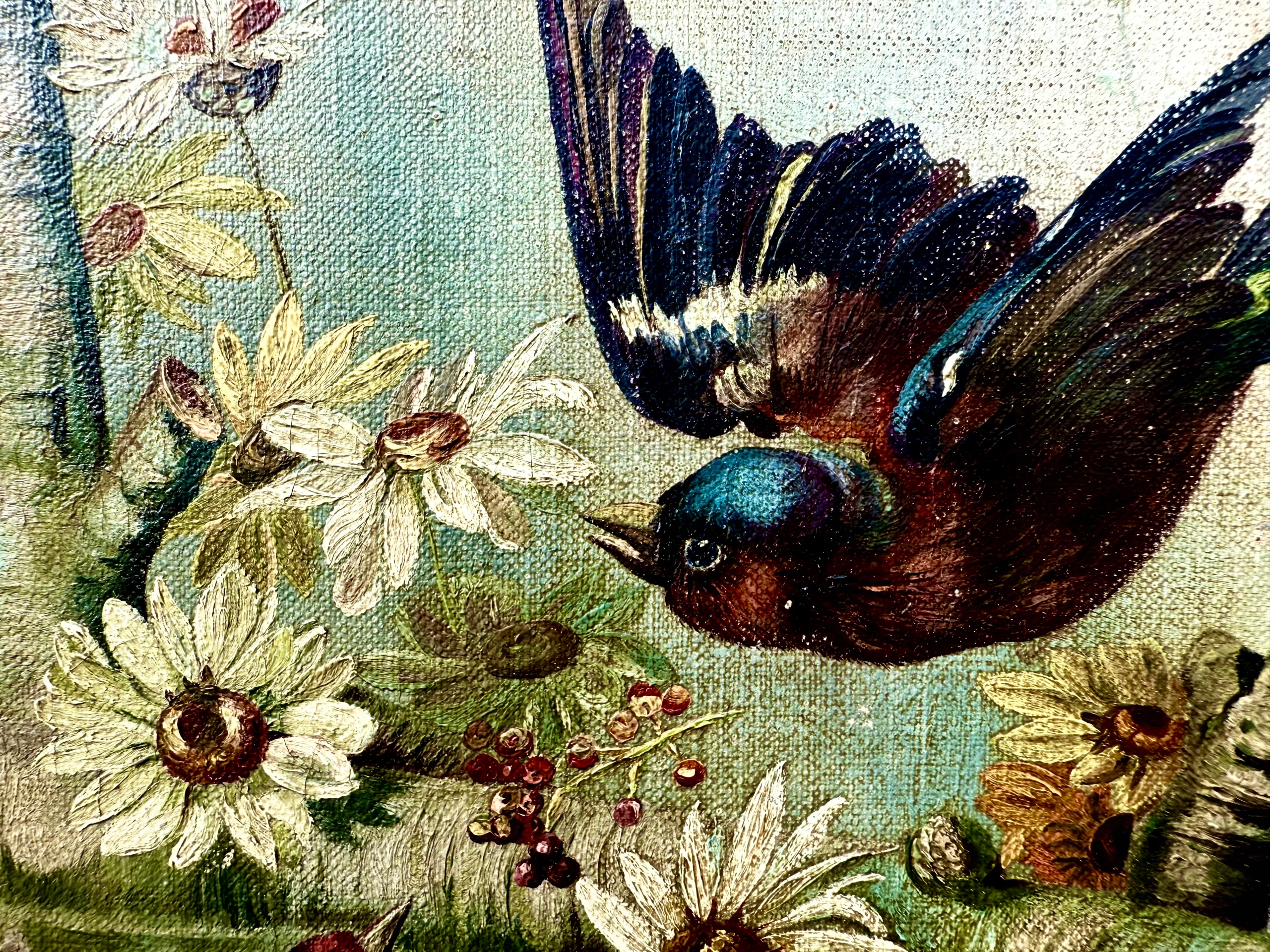 ПТАХ ЗАЛИШАЄТЬСЯ СЕРЕД ДЕРЕВ ТА КВІТІВ ЦІННА ДОВОЄННА КАРТИНА