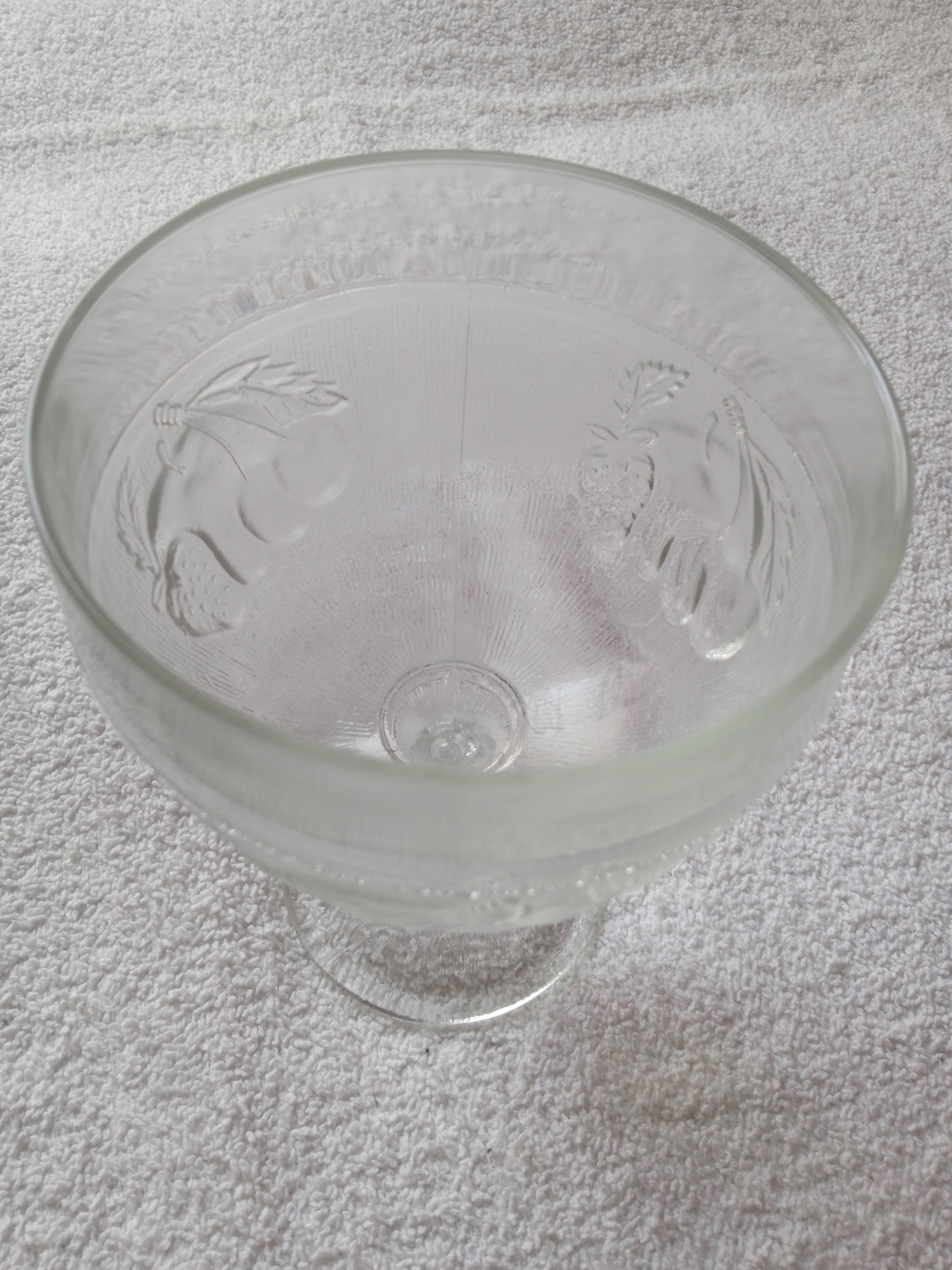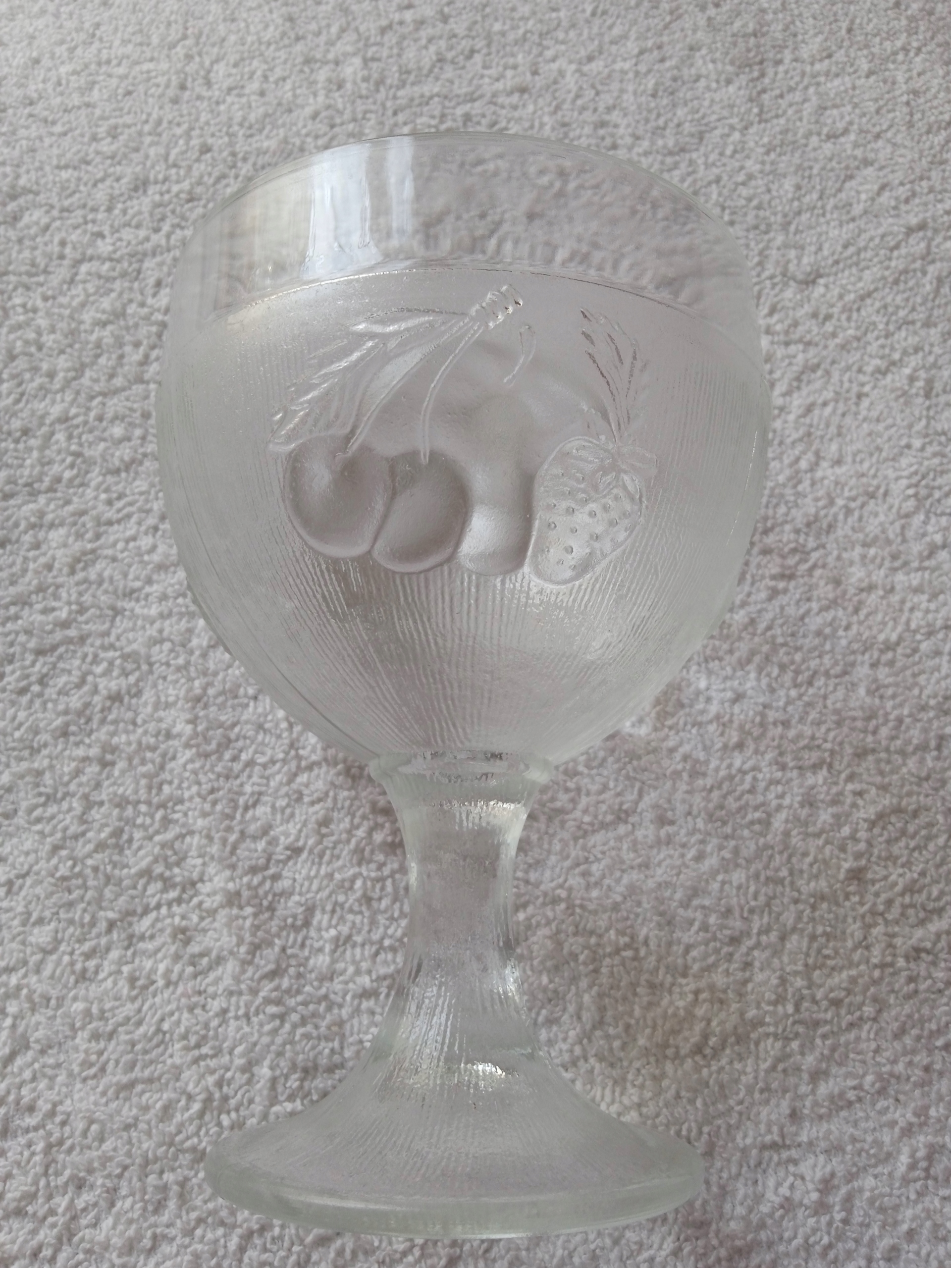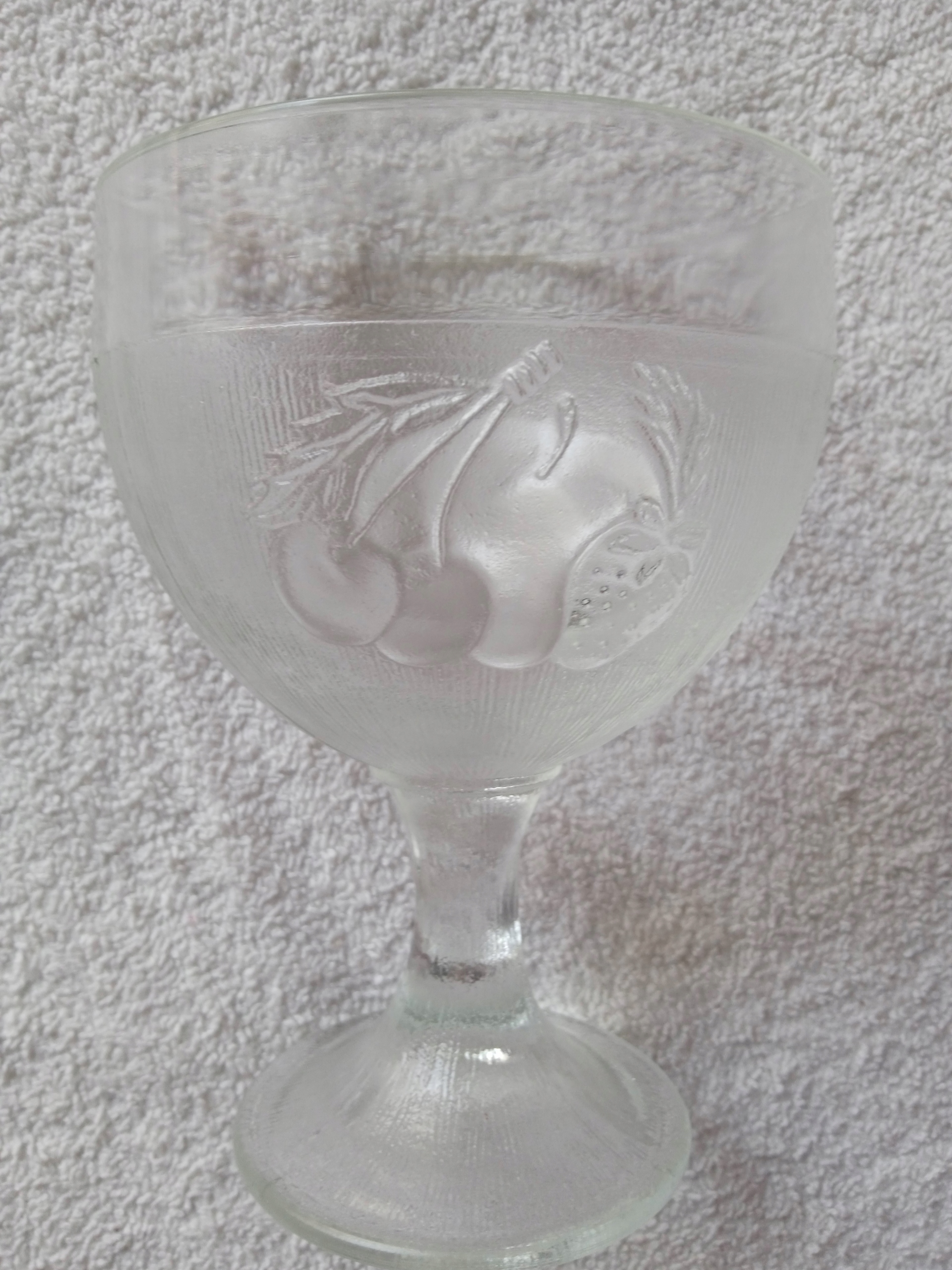 Предлагаю к продаже стаканчик для мороженого/сахарница на ножке, изготовленный из прессованного стекла, украшенный узором из фруктов - яблока, вишни и клубники, на слегка полосатом фоне. Производитель - HSG Ząbkowice, 1980-е гг. Состояние очень хорошее, не использовался, хранился в витрине как украшение. Высота 15 см. Диаметр 10,6 см. Диаметр стопы 7,5 см.
