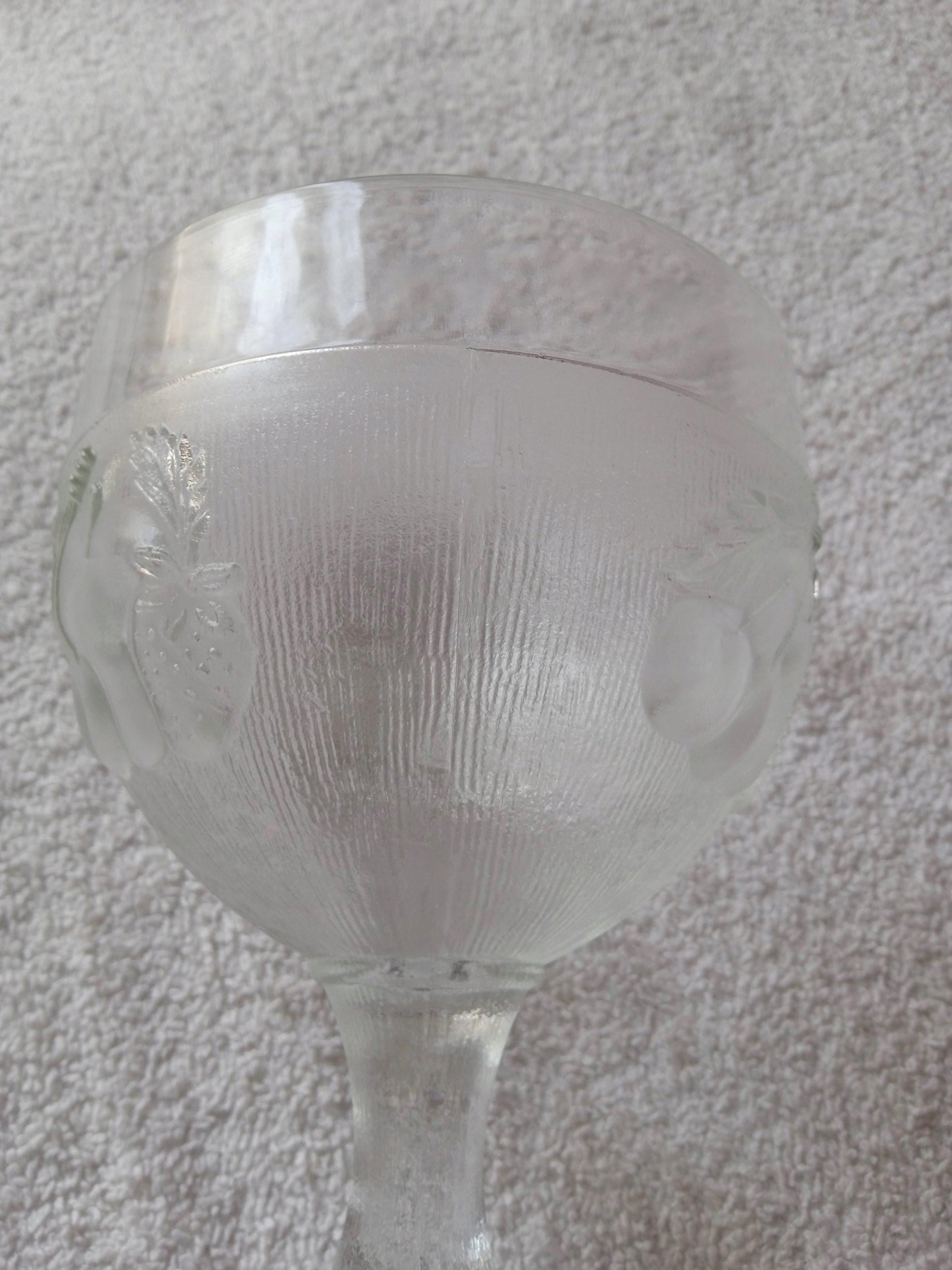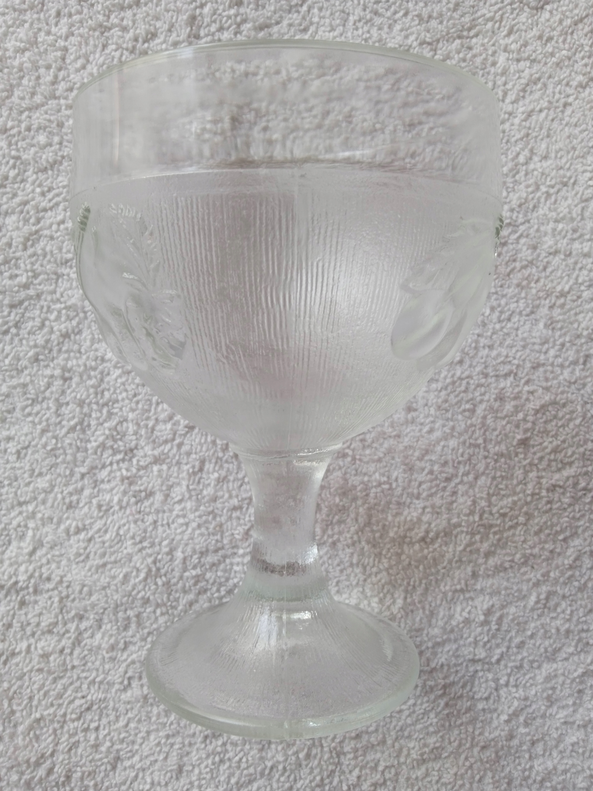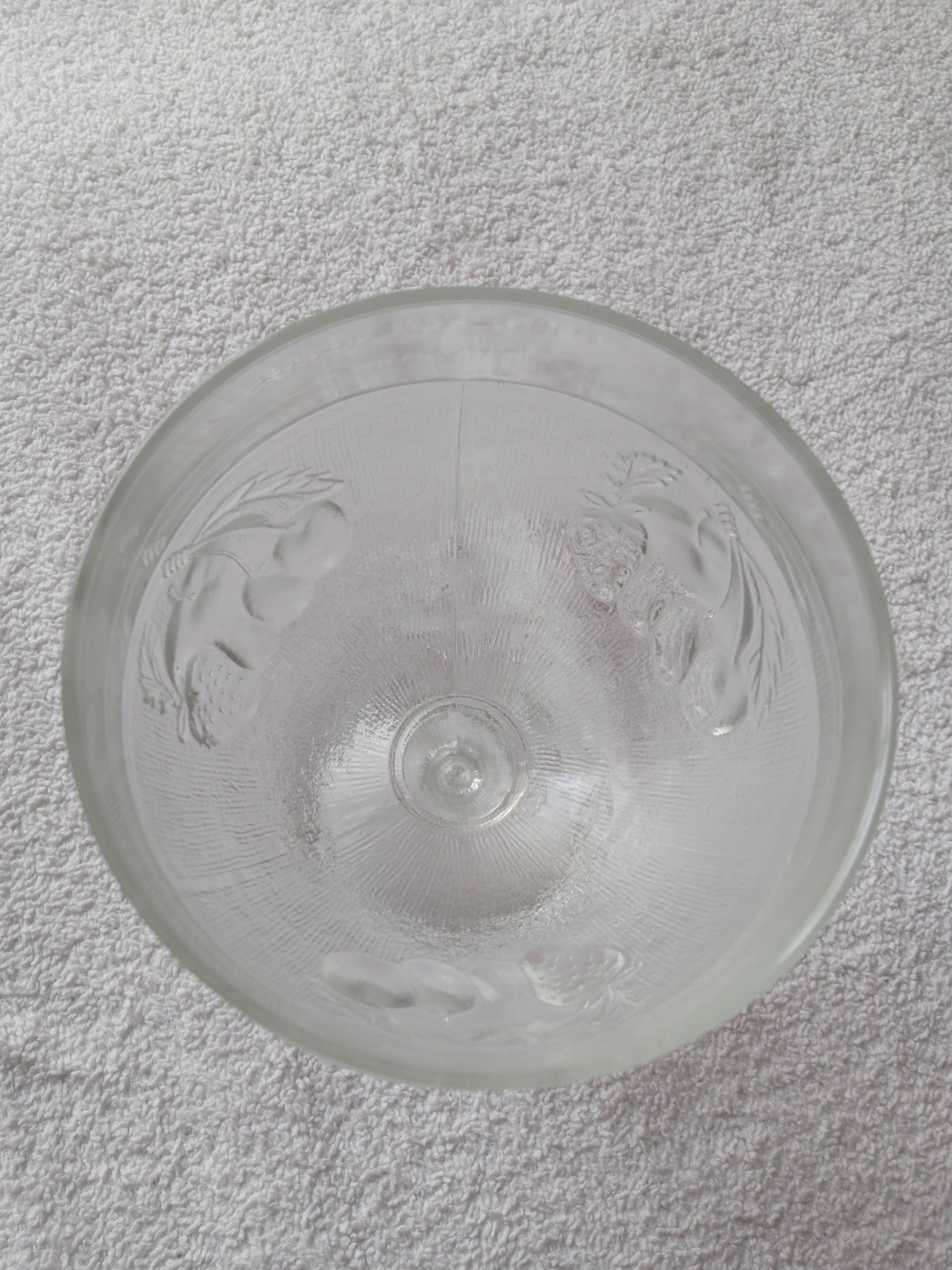 Предлагаю к продаже стаканчик для мороженого/сахарница на ножке, изготовленный из прессованного стекла, украшенный узором из фруктов - яблока, вишни и клубники, на слегка полосатом фоне. Производитель - HSG Ząbkowice, 1980-е гг. Состояние очень хорошее, не использовался, хранился в витрине как украшение. Высота 15 см. Диаметр 10,6 см. Диаметр стопы 7,5 см.