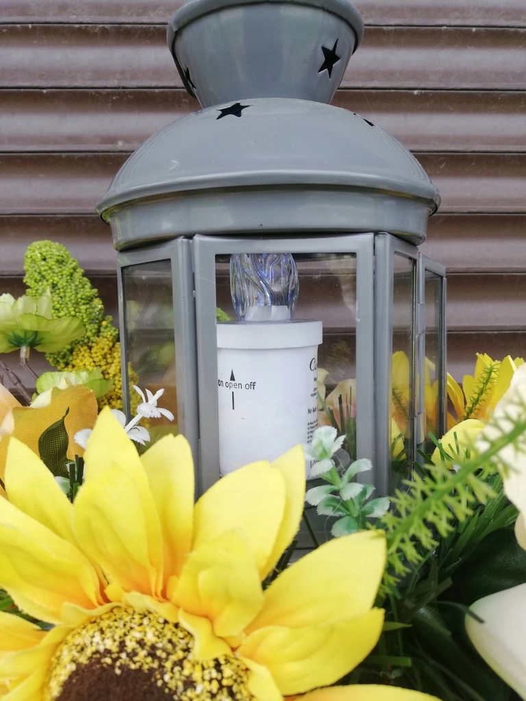 Композиция в пластиковой икебане со стационарно установленной стеклянной свечой в виде открывающегося фонаря, с холодным белым светом. Светодиодная вставка.
