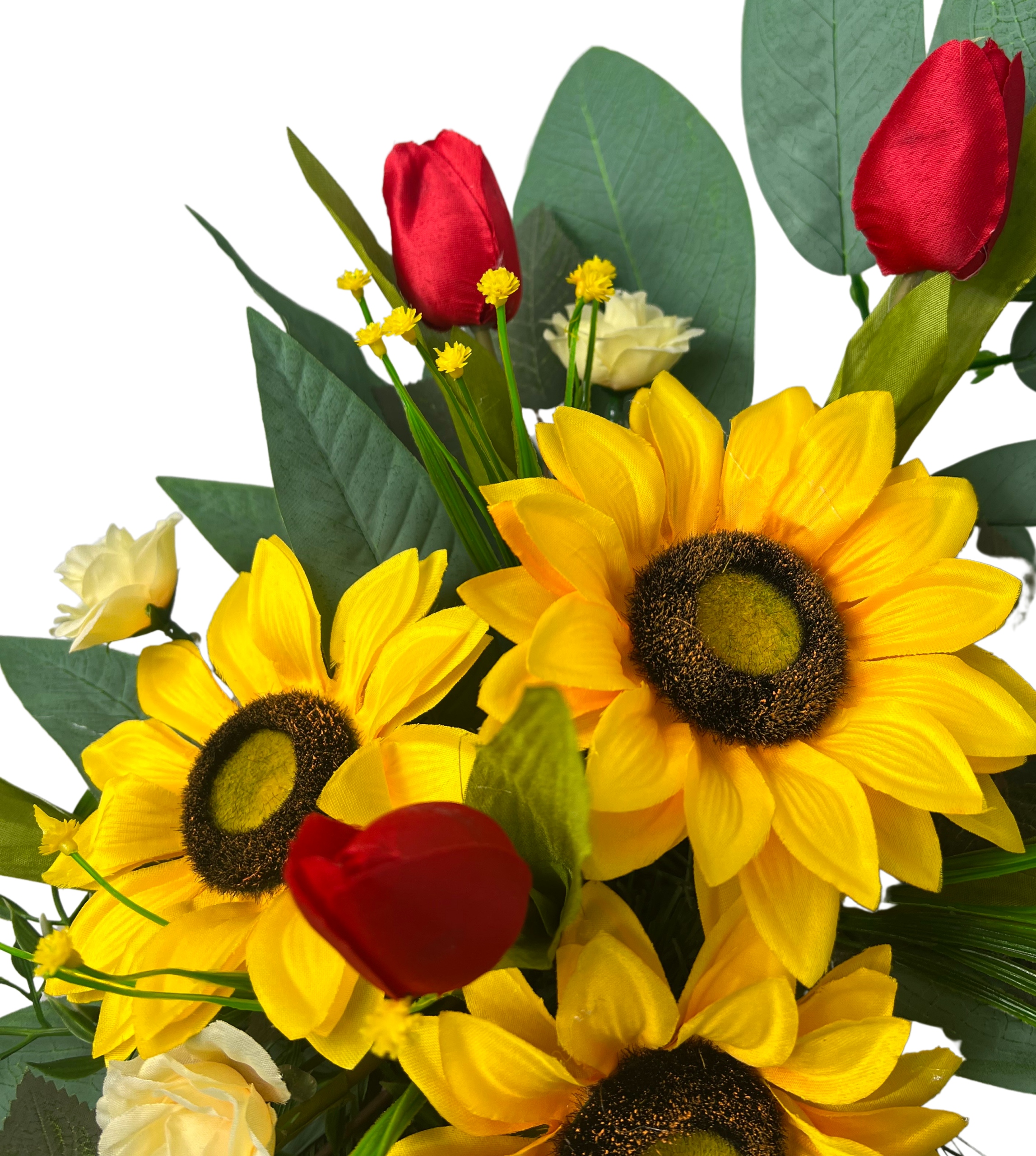 Цветочная композиция изготовлена из искусственных цветов высочайшего качества. и добавки. Для создания украшений были использованы цветы подсолнуха, розы, весенние тюльпаны, большое количество зеленых листьев и украшений, прекрасно заполняющих пустые пространства.