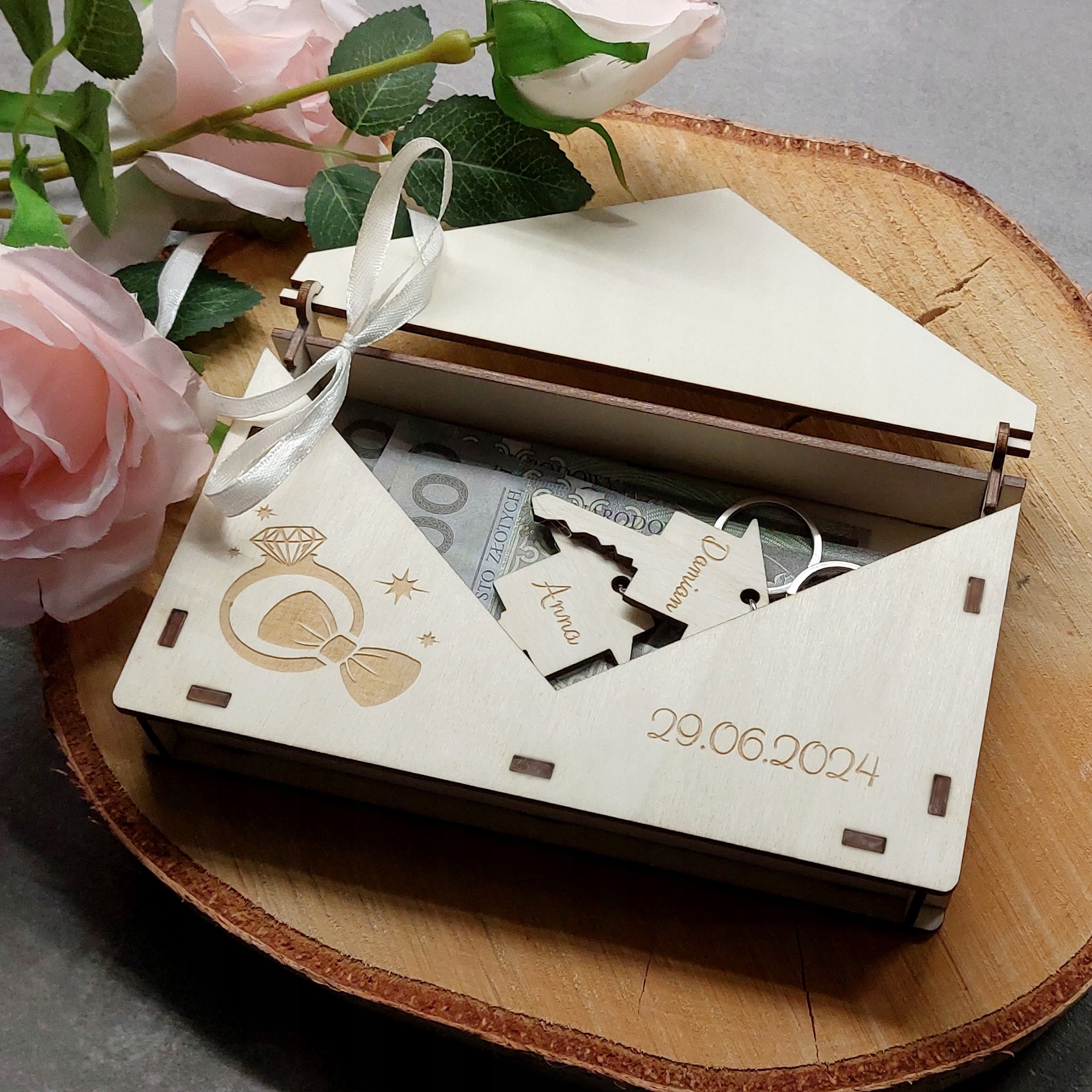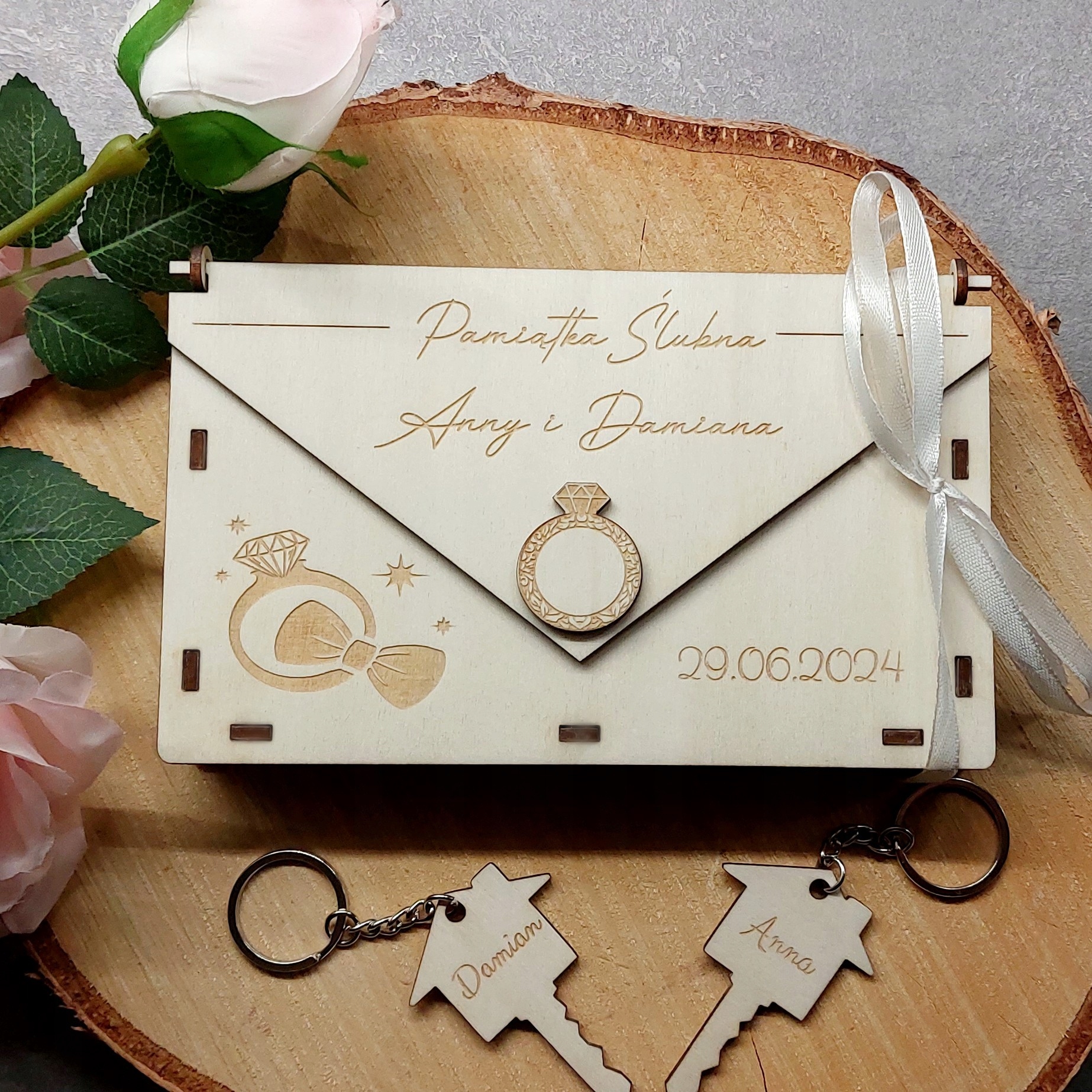 ДЕРЕВЯННЫЙ КОНВЕРТ - КОПИЛКА - СВАДЕБНЫЕ СУВЕНИРЫ С ИНДИВИДУАЛЬНЫМИ ПОЖЕЛАНИЯМИ + 2 брелока с именами!