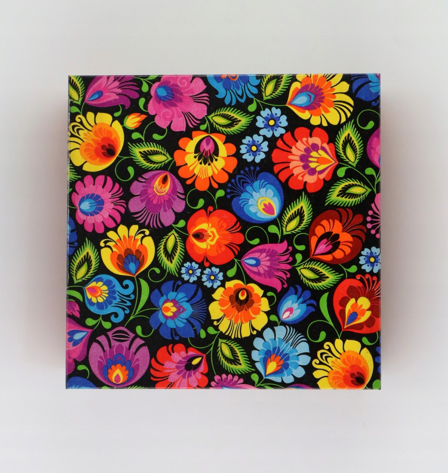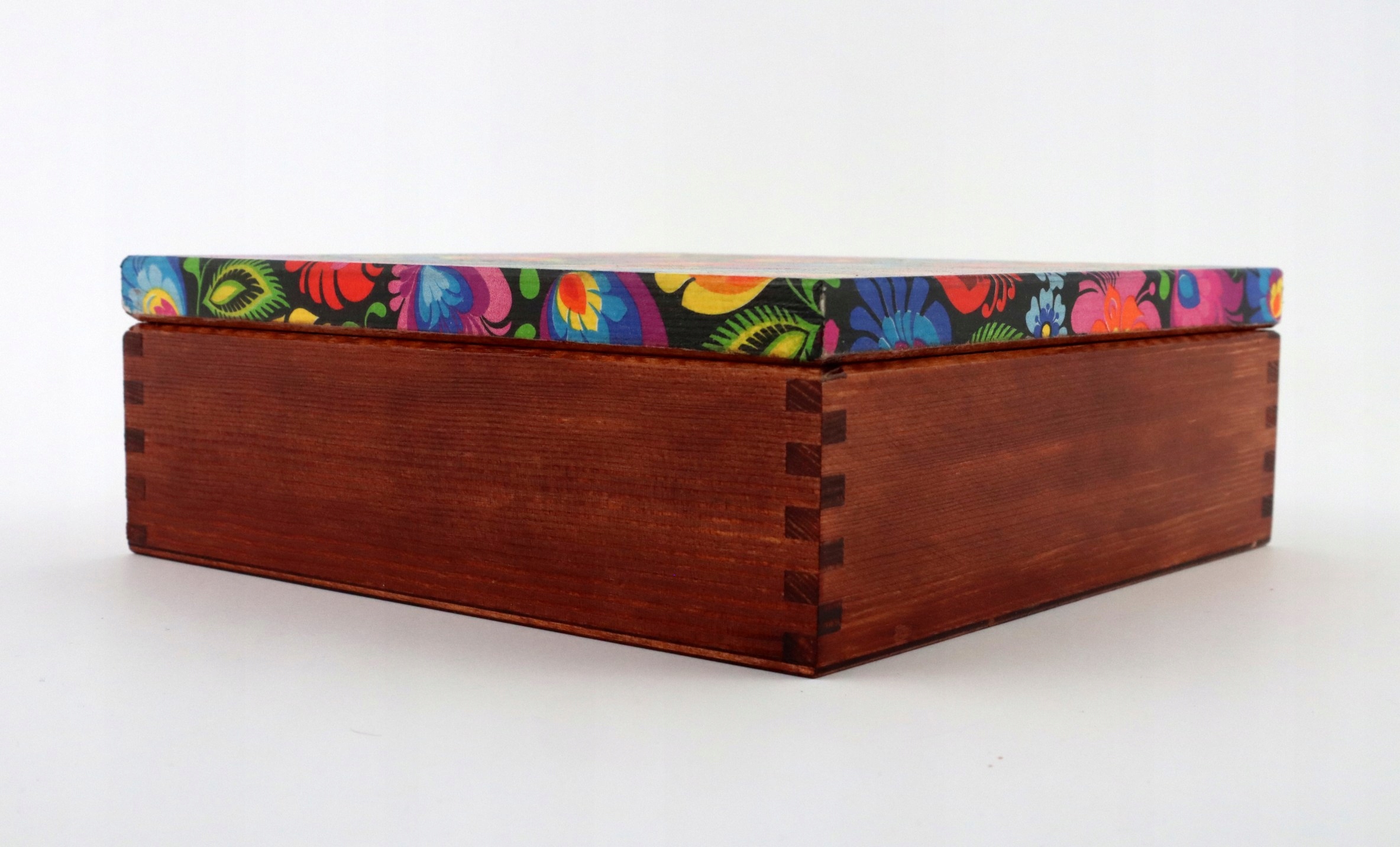 Одним из наиболее характерных элементов этой коробки является узор Ловича. Мы использовали красочный цветочный узор, который прекрасно сочетается с оттенком морилки палисандра на черном фоне. Этот узор придает коробке уникальный фольклорный характер.