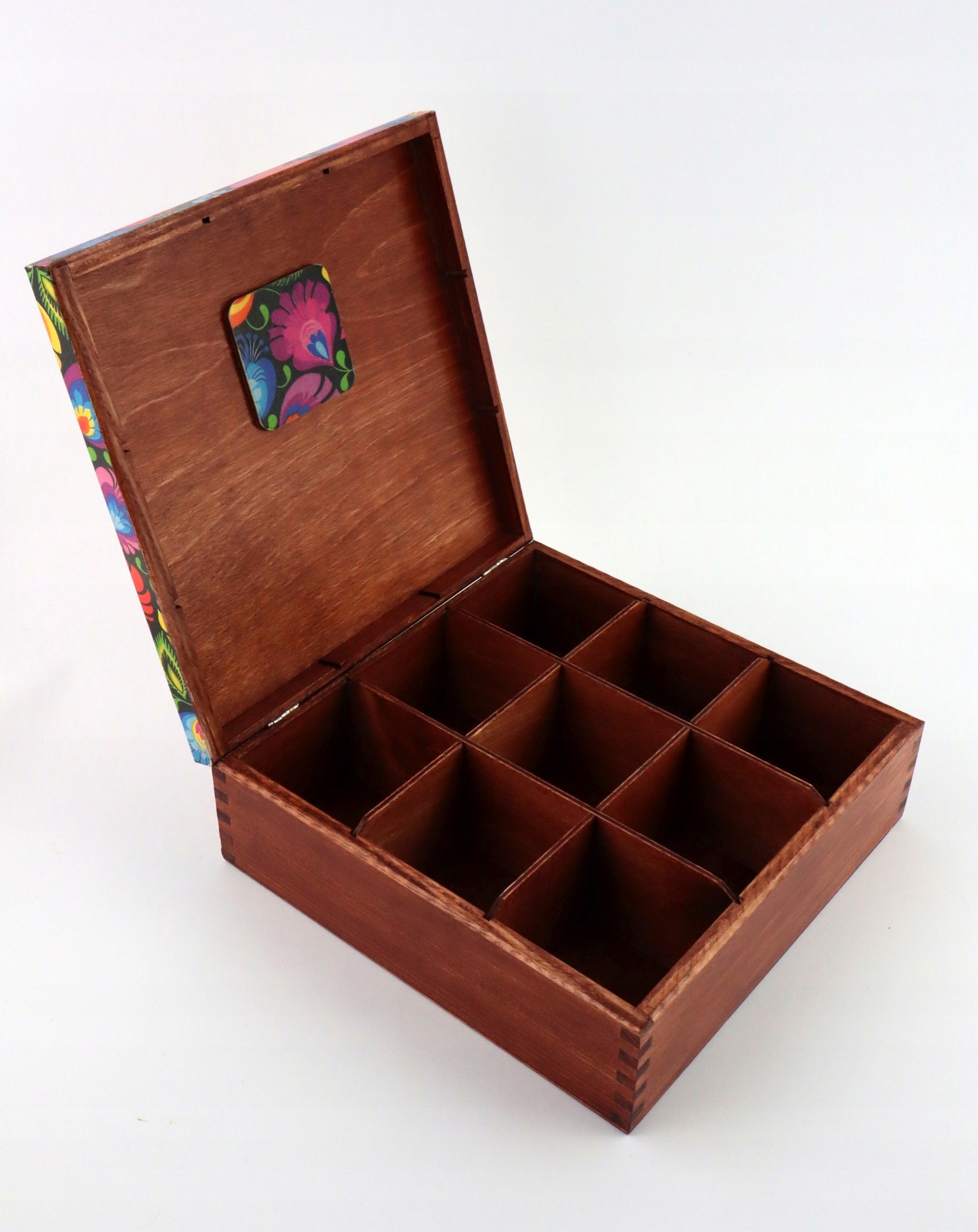 В коробочке девять отделений, в которых можно хранить разные сорта чая или другие мелкие предметы. Размер каждого отделения позволяет разместить отдельные чайные пакетики, пакетики или другие чайные аксессуары. Вы можете удобно организовать свои любимые чаи и иметь к ним легкий доступ в одном месте.