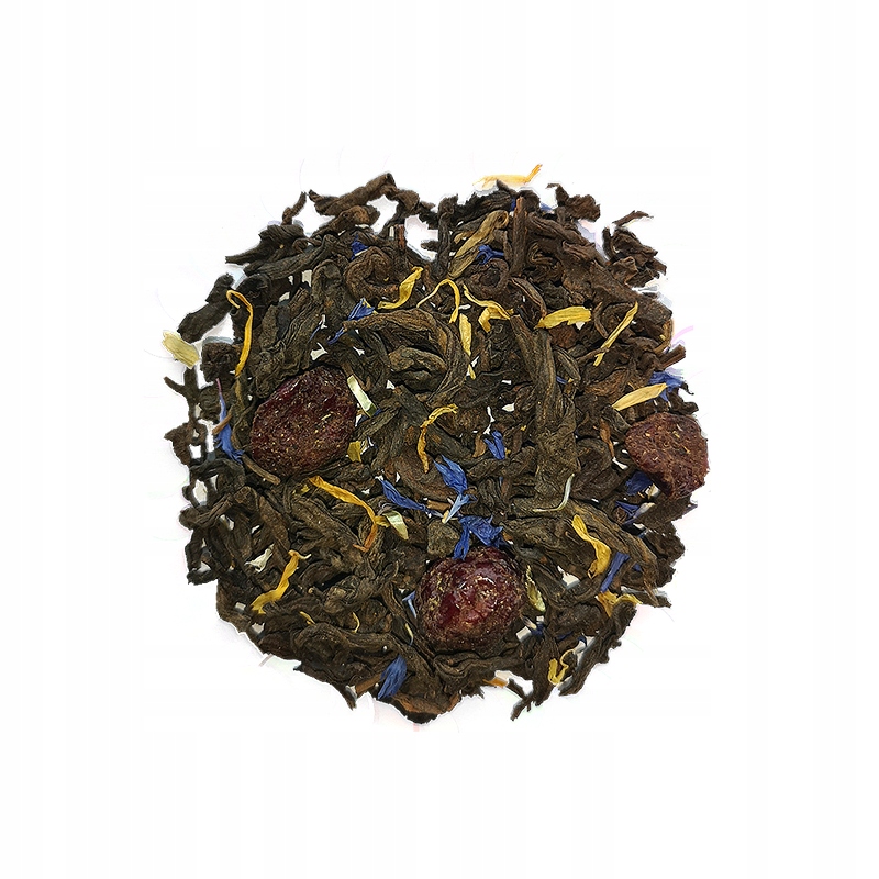 Пуэр крупнолистовой чай с добавлением клюквы, цветков мальвы и семян подсолнечника.