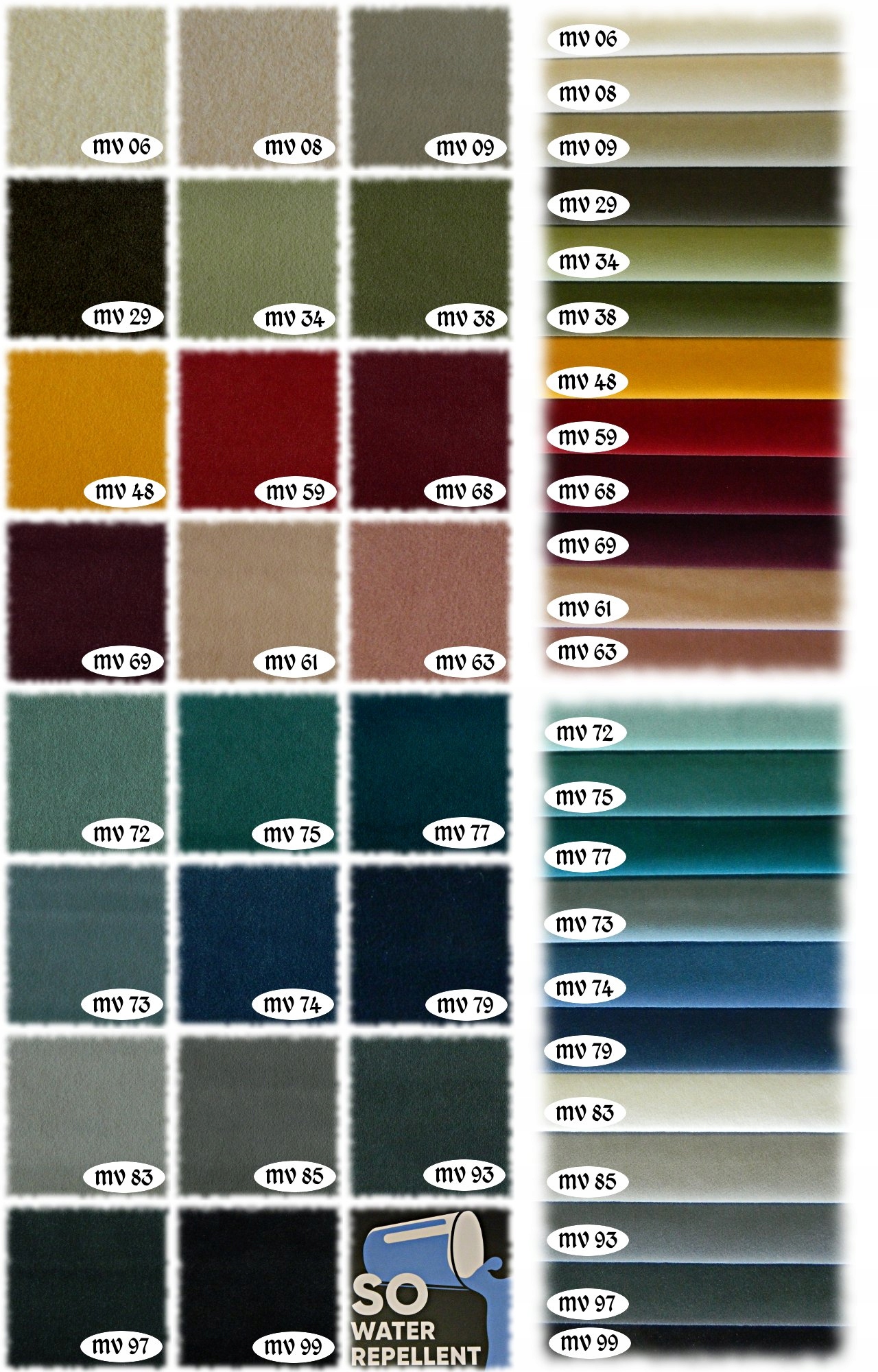 Ткань МВ06-МВ99 – чрезвычайно плотная, прочная и грязеотталкивающая ткань бархат. Выпускается в очень модной матовой цветовой палитре, не растушевывается. С поверхности этой ткани очень легко очистить грязь с помощью мыльного раствора или средства для мытья посуды. Кроме того, он покрыт специальным защитным слоем, создающим гидрофобное покрытие, предохраняющее от быстрого просачивания жидкостей, вызывающего конденсацию жидкости на поверхности материала, благодаря чему мы можем удалить пролитую жидкость тканью или бумажным полотенцем. . Вес: 430 г/м2, устойчивость к истиранию: > 100 000 циклов.