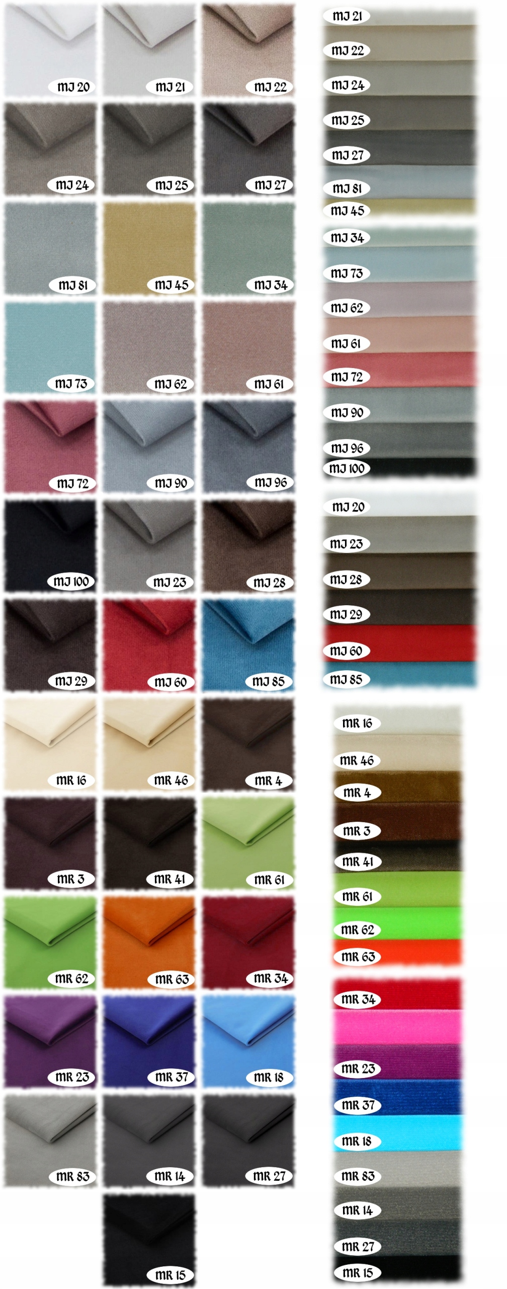 MJ20. белый, MJ21. бежевый(светлый), MJ22. бежевый (темный), MJ24. серо-коричневый(светлый), MJ25. серо-коричневый, MJ27, серо-коричневый (темный), MJ81. светло-серый, MJ45. желтый(выкл.), MJ34. мятный, MJ73. синий(выкл.), MJ62. фиолетовый(выкл.), MJ61. пудрово-розовый (тусклый), MJ72. розовый(выкл.), MJ90. серый, MJ96. графит, MJ100.черный, MJ23. серо-коричневый(мышиный), MJ 28. коричневый(темный), MJ29. коричневый (очень темный), MJ60. красный, MJ85. бирюзовый(сине-зеленый).