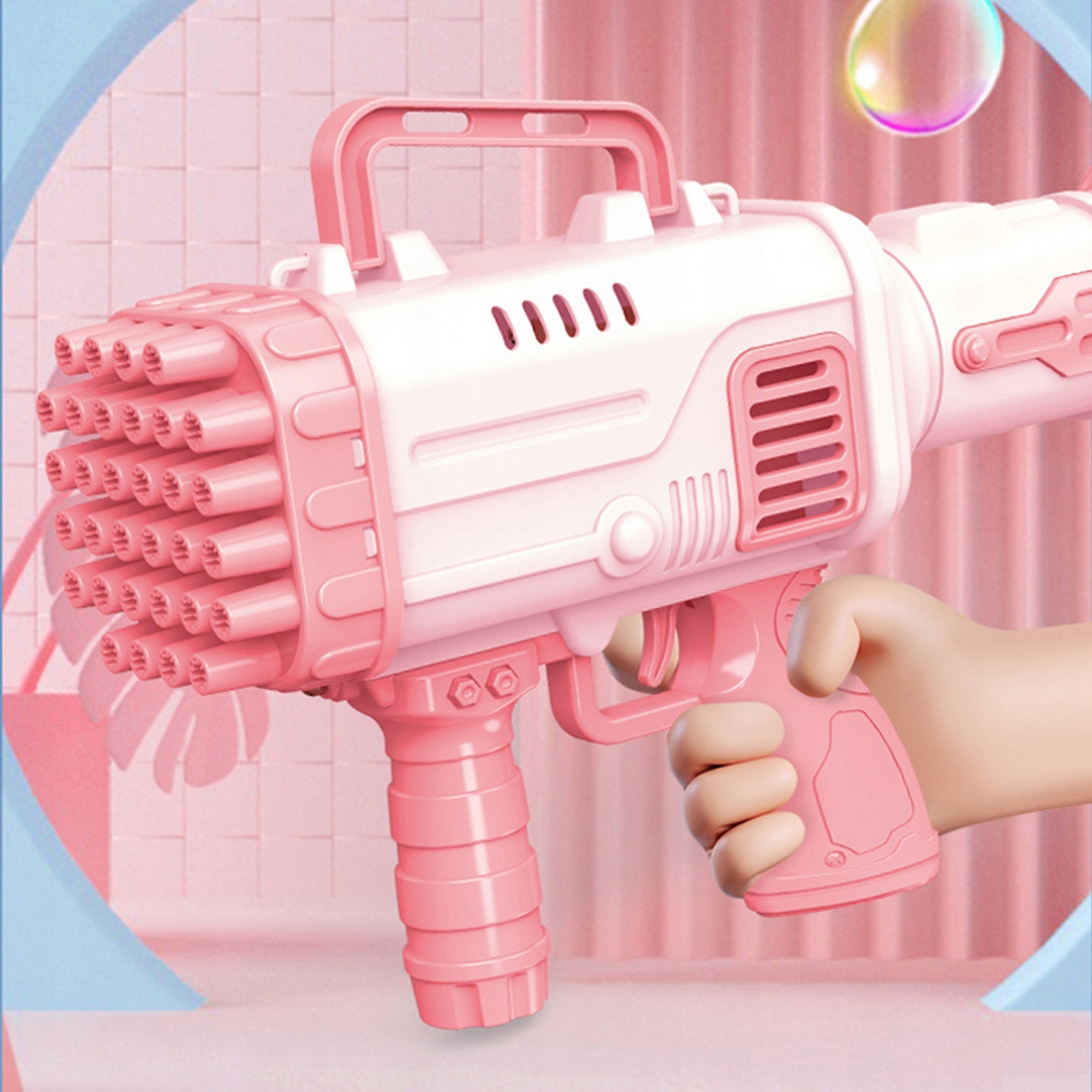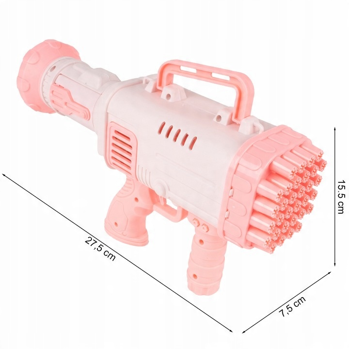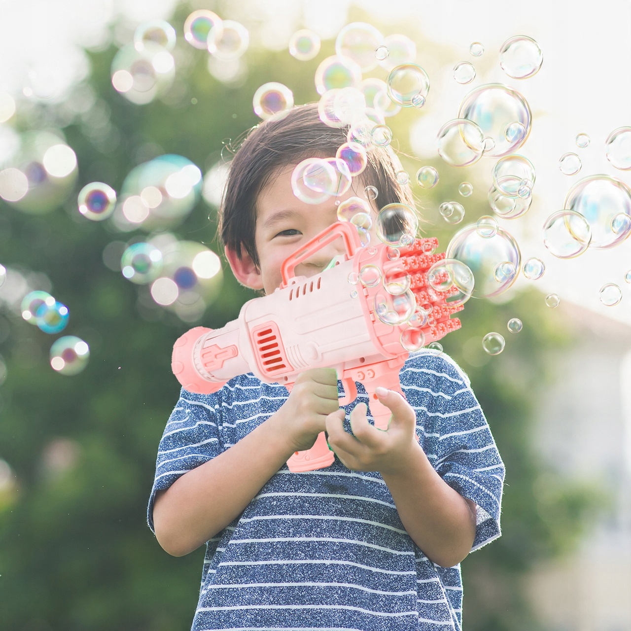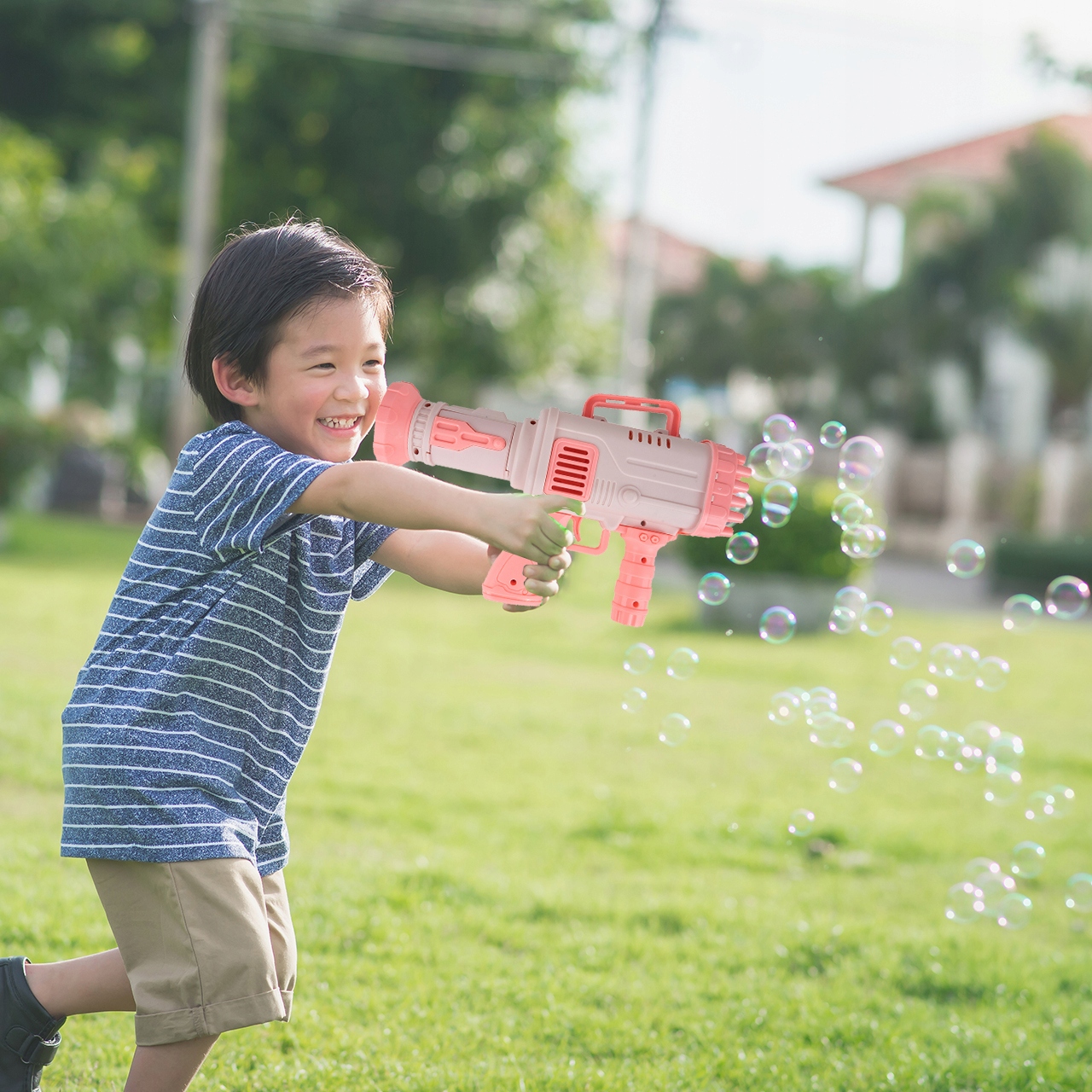 Налейте жидкость в емкость, идущую в комплекте, а затем погрузите в нее отверстия в передней части пистолета. Нажмите на спусковой крючок базуки и все! С этого момента вы можете наслаждаться видом красивых, радужных пузырей, парящих в воздухе, вылетающих сразу из 32 отверстий!