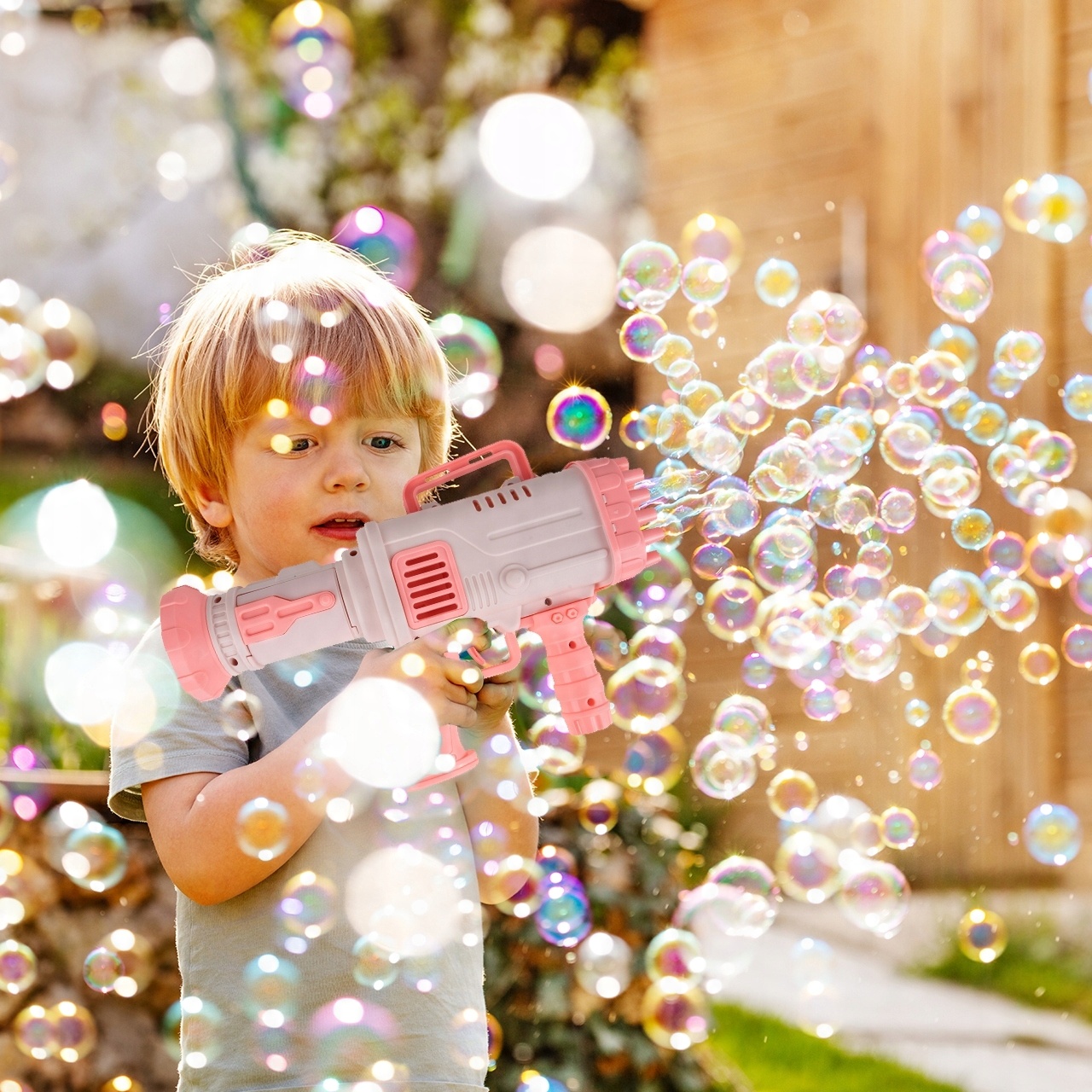 Мыльные пузыри — любимая игра маленьких и больших детей. Фантастическая машина для мыльных пузырей в виде супербазуки доставит массу удовольствия каждому ребенку. Полюбуйтесь десятками радужных мыльных пузырей, парящими в воздухе.