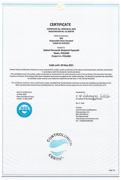 Наша фабрика — одна из немногих в Польше, которая производит перья и пух, сертифицированные RDS