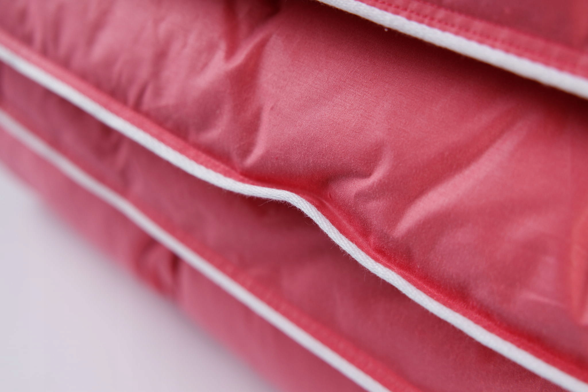 Одеяло кремового цвета отделано по краям золотым хлопковым стеганым полотном (новое), а в случае розового одеяла - белым стеганым одеялом, которое украшает изделие и дополнительно запечатывает его края. Одеяла выполнены панельным методом – наполнитель распределяется равномерно и не смещается. После заполнения сырье не может перемещаться между камерами. Одеяло, изготовленное с помощью этой системы, создает равномерный изоляционный слой по всей поверхности. Он не имеет «холодных зон» в местах сшивания, что гарантирует очень хорошую теплоизоляцию.