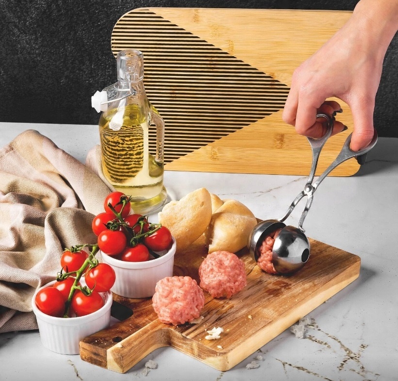 Длинная ручка в виде ножниц облегчает получение ускоряющегося и формирования измельченного мяса. Два отверстия в форме позволяют избыточному мясу при сжатии. Вы можете быстро и легко приготовить вкусные фрикадельки