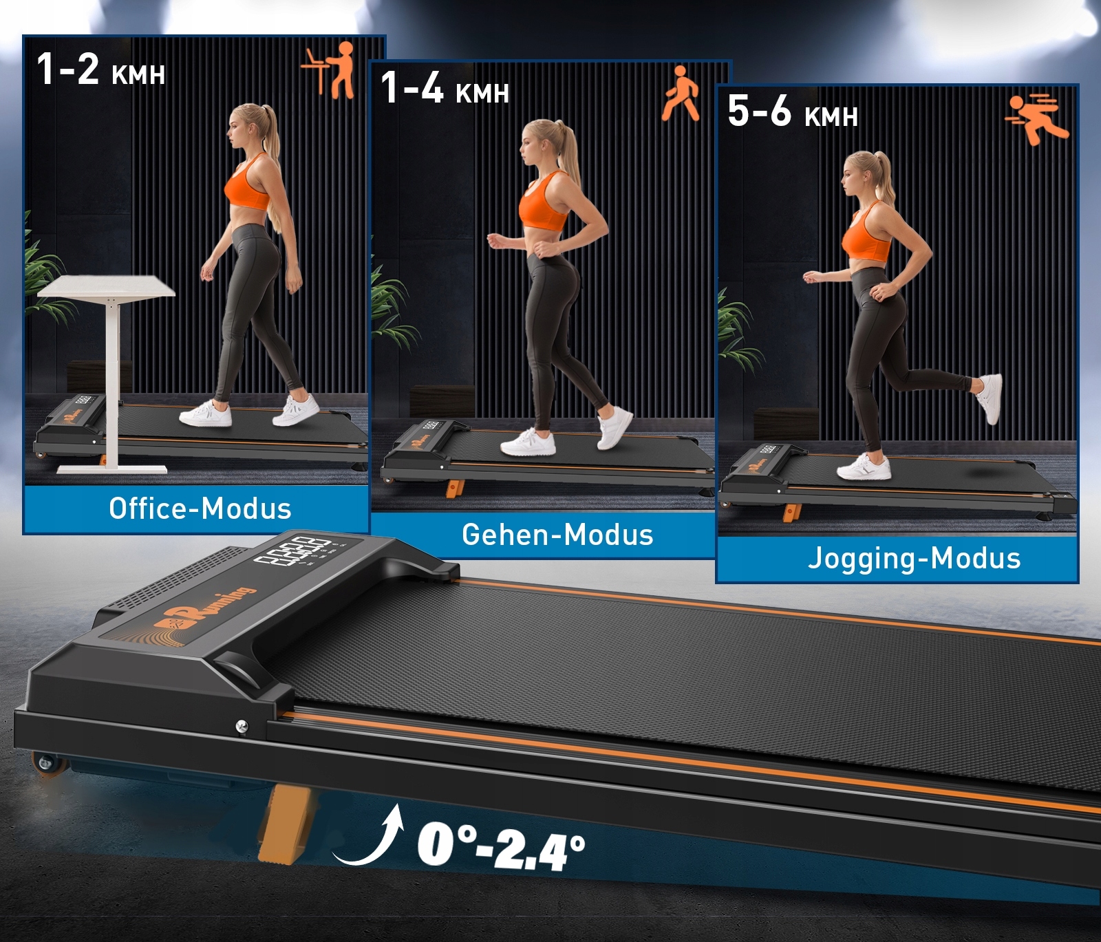 Преобразование своего рабочего дня в фитнес-сессию благодаря этому черному стальному гонщику. Оснащенный наклоном 2,4 ° для более 60% большего сжигания калорий, тихий двигатель с 440 Вт и шокирующей технологией - все предварительно создано для немедленного использования. Поддерживает до 120 кг (265 фунтов)!