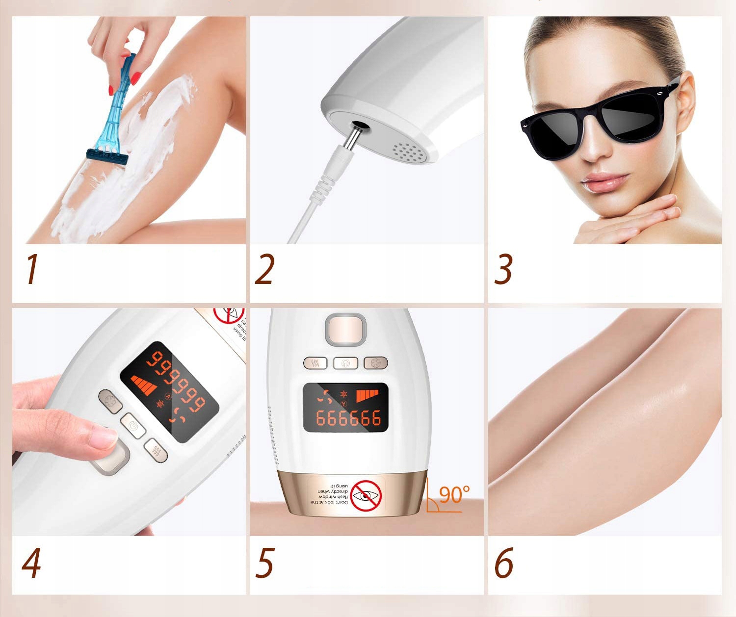 999 999 Flashes - максимального количества вспышек достаточно, чтобы навсегда удалить волосы в период роста волос 18-24 месяца. Технология интенсивного пульсирующего света IPL фокусирует легкую энергию на луке волос, не повреждая кожу и поглощает меланин, нагревая волосяные фолликулы и ингибирует рост волос.
