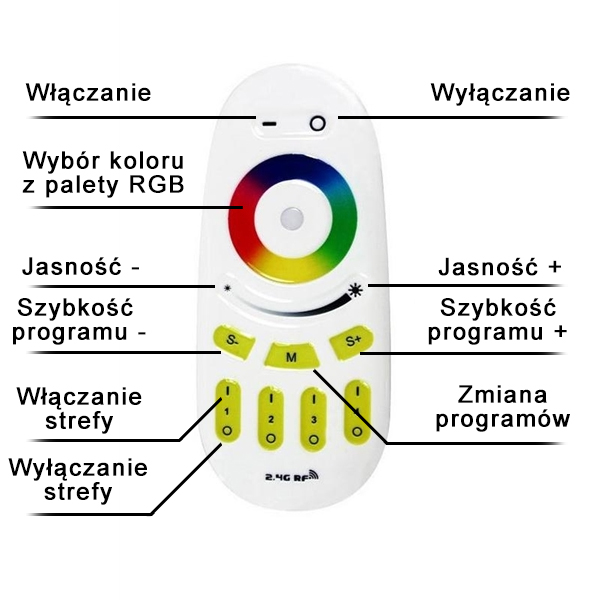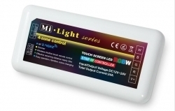Контроллер работает с сенсорным пультом дистанционного управления, предназначенным для дистанционного изменения цвета и режима освещения в светодиодных лентах RGB и RGBW. Радиоконтроллер не требует наведения непосредственно на приемник сигнала, его можно полностью встроить, например, за гипсокартонную стену. Конструкция контроллера позволяет подключать светодиодную ленту без необходимости пайки.