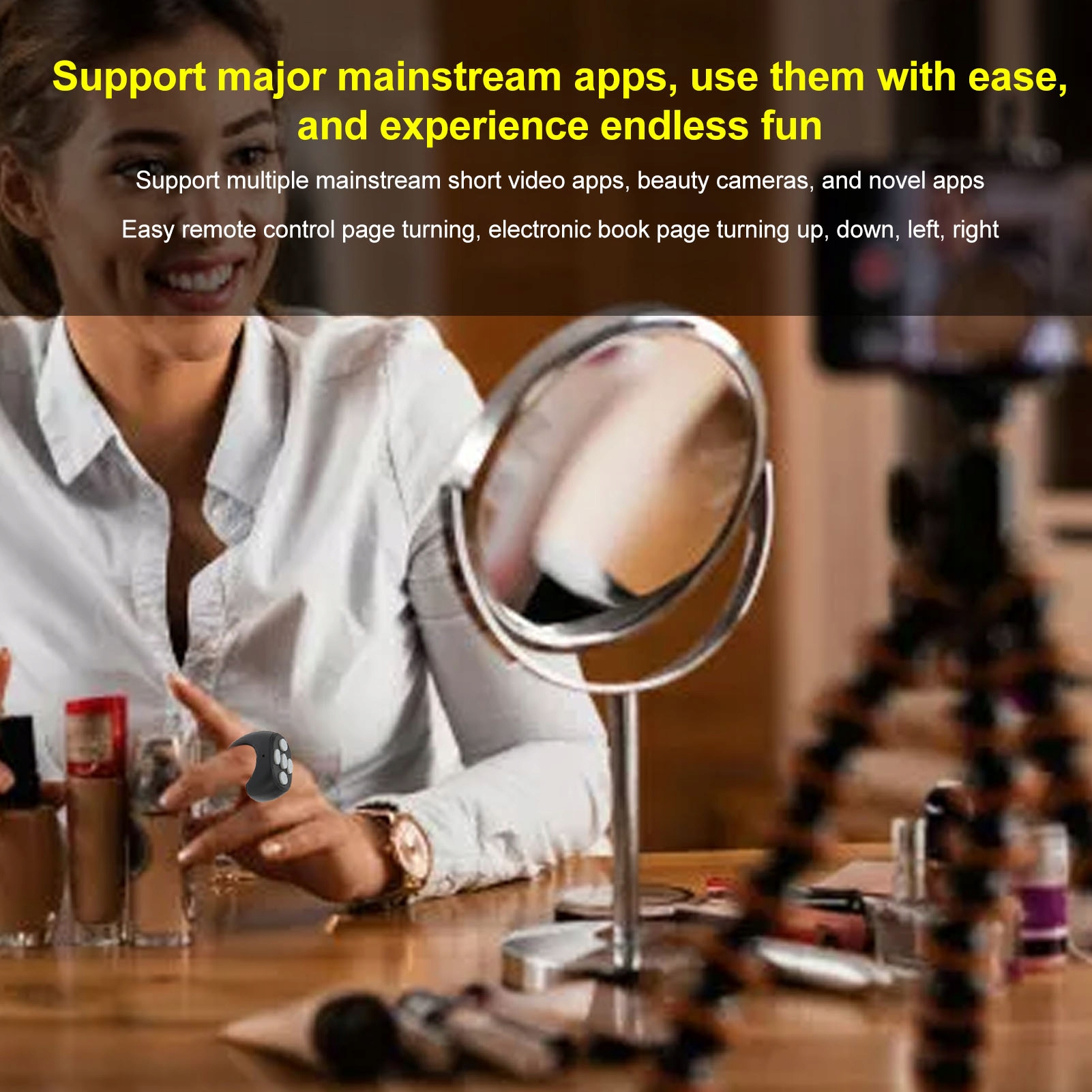 3 (Поддержка основного приложения для коротких видео) Кольцо дистанционного управления с помощью Bluetooth на телефоне поддерживает множество популярных приложений для коротких видео, камер красоты и новинок.