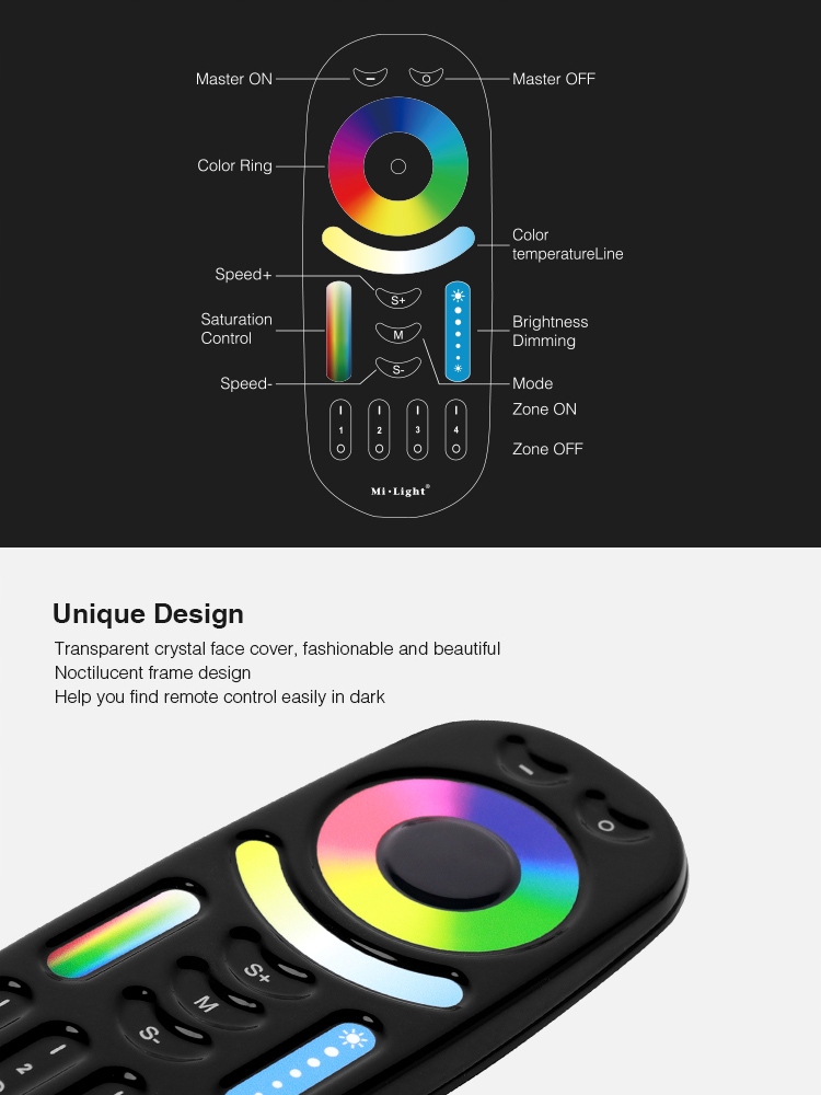Инновационный 4-зонный сенсорный пульт дистанционного управления позволяет управлять каждой из 4 зон индивидуально с помощью радиоприемника. Он позволяет получить любой цвет из цветовой палитры RGB, а также активно менять интенсивность яркости вместе с цветовой температурой CCT — то есть также позволяет менять цвет освещения с теплого на холодный. Передатчик работает с устройствами Mi-Light, такими как приемники, лампочки, светильники, модули Wi-Fi.