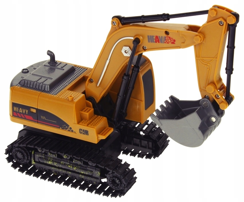 Экскаватор с дистанционным управлением передвигается по резиновым гусеницам. Он имеет широкий спектр возможностей управления с помощью прилагаемого пульта дистанционного управления. Экскаватор движется вперед, назад и вращается влево и вправо. Подвижная стрела с ковшом облегчает погрузку и разгрузку.