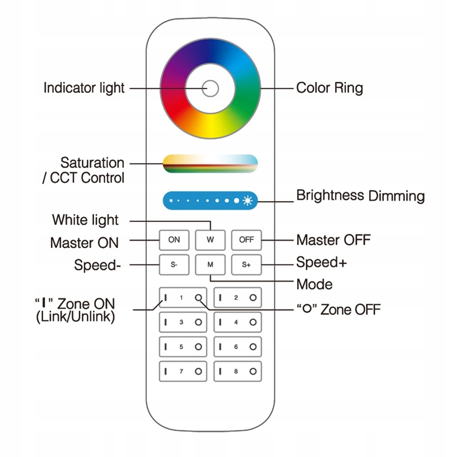 Пульт дистанционного управления позволяет управлять освещением от 1 до 8 независимых зон RGB или RGB+W и светодиодов CCT. К одной зоне на пульте можно подключить множество цепей освещения.