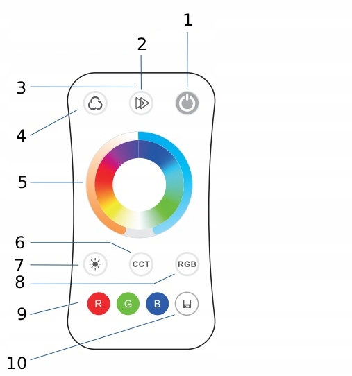 - Функции: ВКЛ/ВЫКЛ, выбор цвета, насыщенность, регулировка яркости и температуры белого