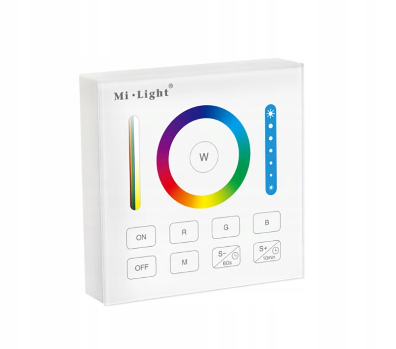 Однозонный настенный пульт дистанционного управления B0 Mi-Light — это устройство, предназначенное для управления всеми продуктами Mi-Light (кроме FUT037 и FUT038). Настенный пульт дистанционного управления позволяет плавно регулировать яркость, цвет света, насыщенность и цветовую температуру белого света. Связь с продуктами происходит беспроводным способом. Устройство предназначено для поверхностного монтажа с помощью прилагаемого двустороннего скотча или шурупов. Также в пульте есть дополнительная функция отключения света через определенное время, что поможет нам безопасно добраться до нужного места. Он питается от двух батареек типа ААА 3 В.