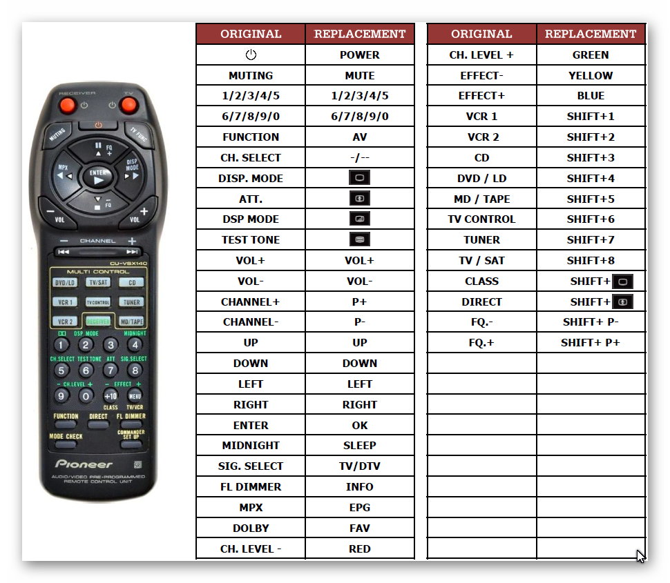 программируемый пульт дистанционного управления с кодами PIONEER, поддерживающий, среди прочего, аудиоустройства:
