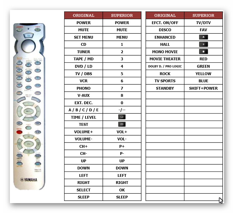 Пульт дистанционного управления, запрограммированный с помощью кодов YAMAHA