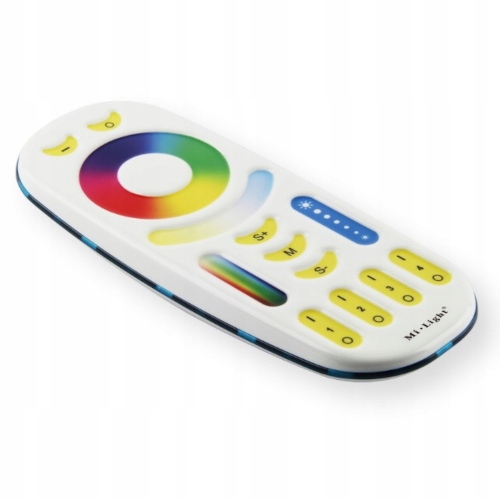 Пульт дистанционного управления RGB/CCT Mi-Light FUT092 — это интеллектуальный контроллер, который позволит вам не только управлять светодиодным освещением с изменяемым цветом света, но и разделять его на 4 индивидуально управляемые зоны. На тачскринном пульте вы найдете 4 кнопки выбора зоны, с помощью которых можно включать или выключать ту или иную секцию, а также менять цвет света, цветовую температуру и приглушать или увеличивать его яркость с помощью трех основных ползунков и кольца выбора зоны. Цвет RGB.