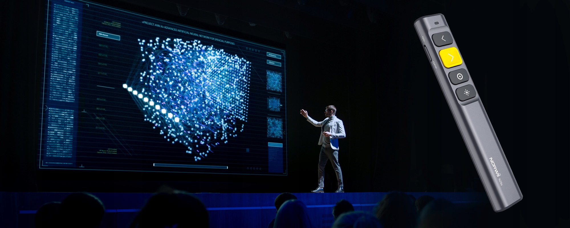 Внимание к деталям — особенность, которая отличает бренд Norwia от конкурентов. Наиболее часто используемая кнопка — это та, которую вы используете для смены слайдов. В модели N28 он имеет специальную выемку и другой цвет. Таким образом, вам не придется смотреть на пульт дистанционного управления, чтобы ваш палец попал именно туда, куда вам нужно. Компактные размеры и правильное расположение кнопок также обеспечивают надежный захват и интуитивное управление.