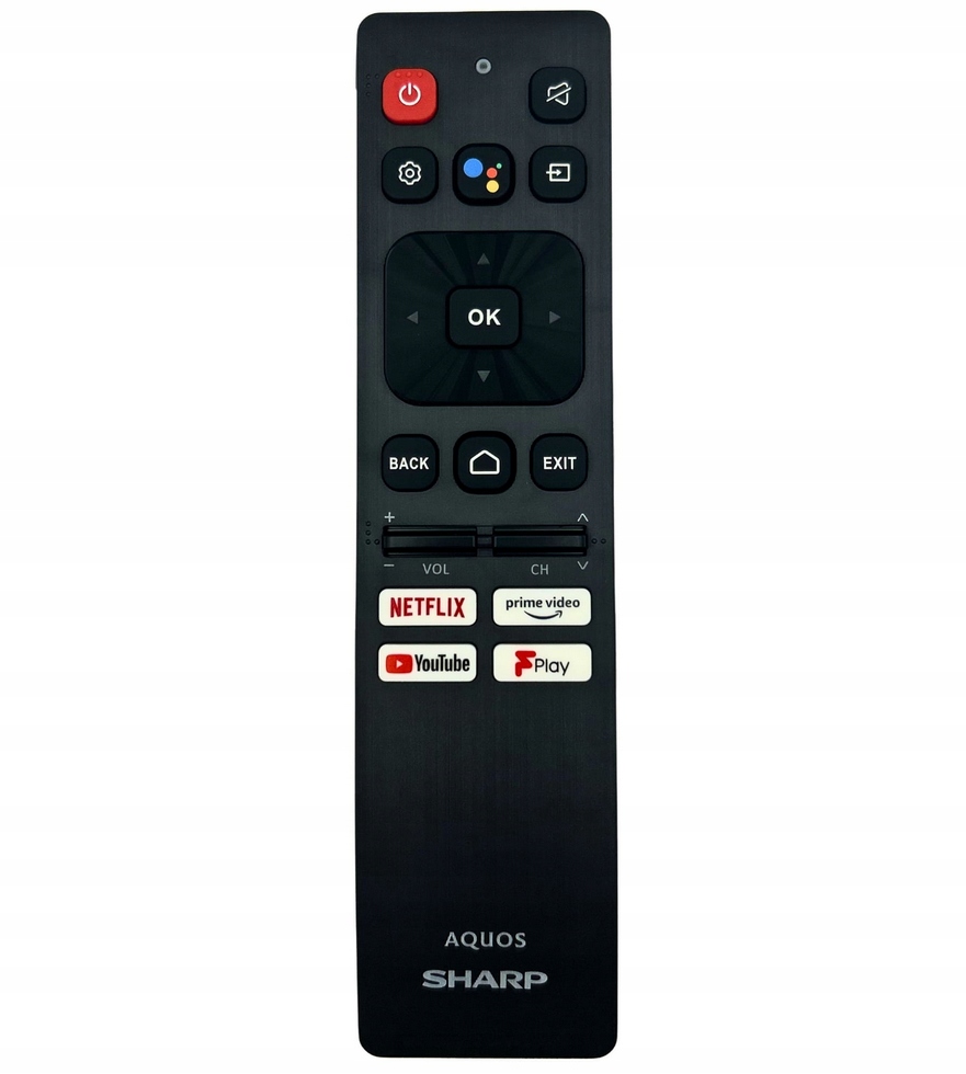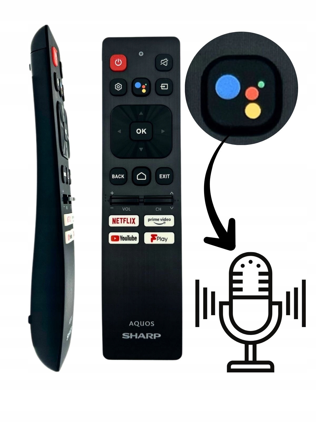Оригинальный пульт дистанционного управления Sharp для телевизоров Aquos с Android TV/Google TV. Он имеет быстрые кнопки для Netflix, Prime Video, YouTube, Google Play и микрофон для Google Assistant. Работает через инфракрасный порт (ИК). Новый, упакованный.