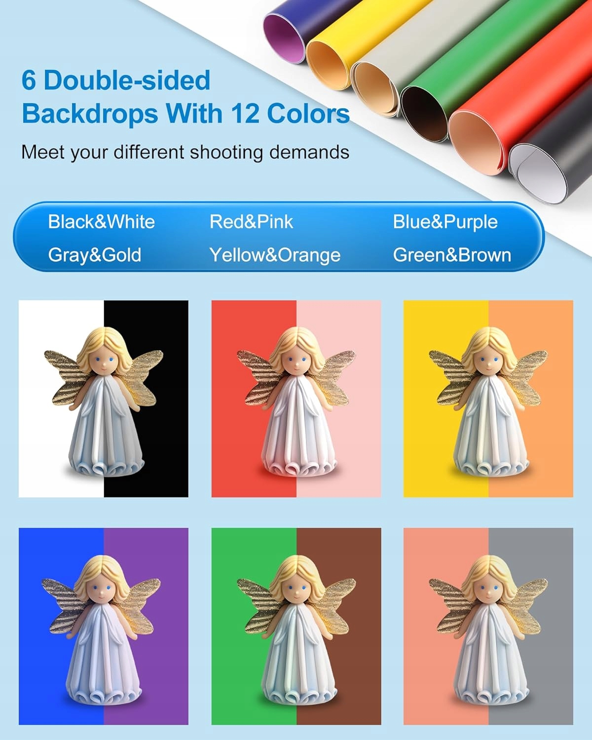 - Световой короб для фотостудии с 6 съемными бумажными фонами разных цветов, двухцветный, всего 12 цветов (черный, белый, серый, золотой, желтый, оранжевый, красный, розовый, синий, фиолетовый, зеленый, коричневый) будет поставляться вместе со световым коробом для фотостудии.
