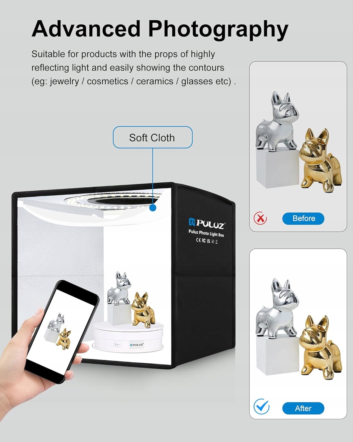 - Фотобокс с USB-портом для зарядки, специальная складная конструкция для хранения, легкий, удобный для переноски. Его можно установить очень быстро без инструментов, он очень удобен в использовании.