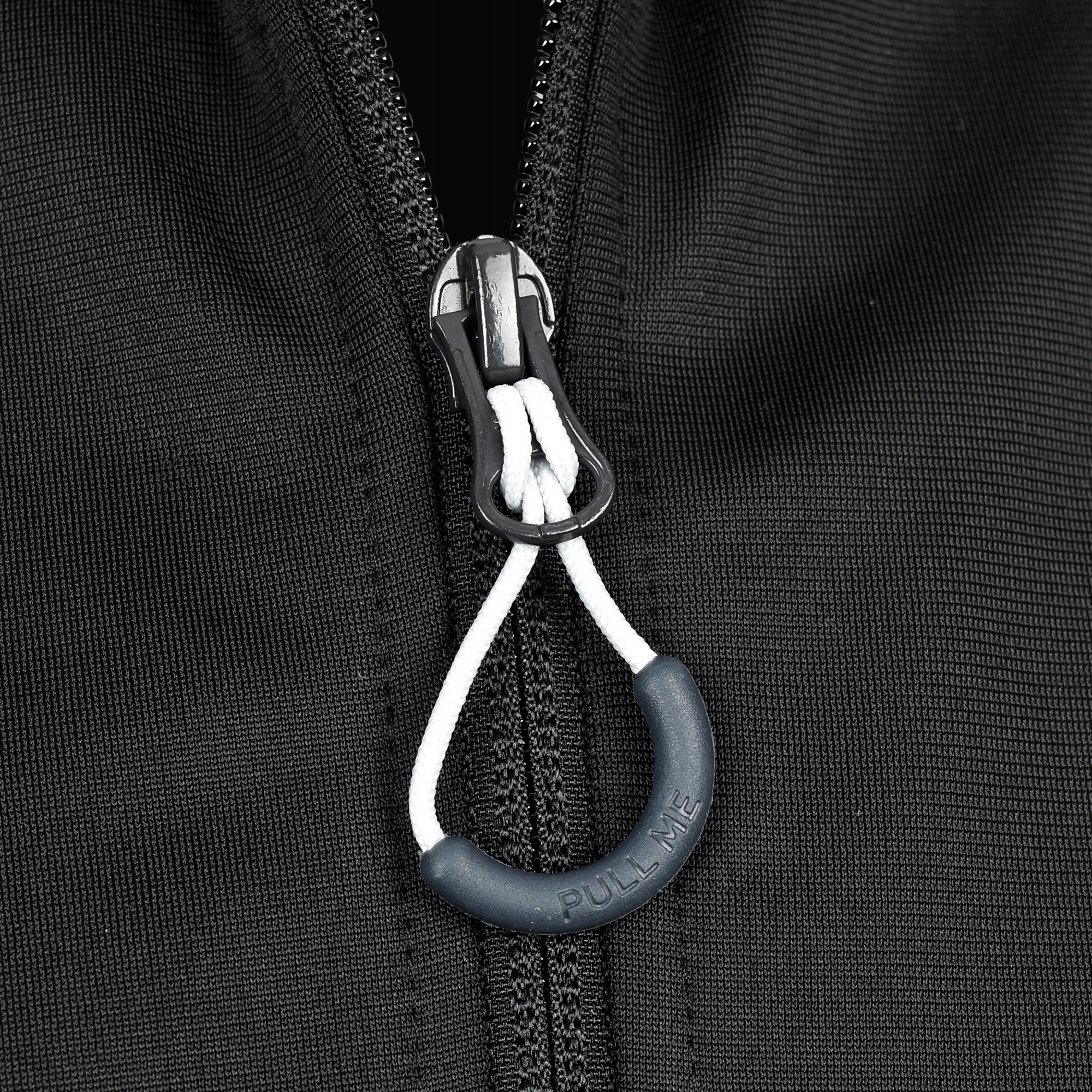 Толстовка оснащены двумя боковыми карманами, полностью застегиваются на молнию, заканчиваются воротником-стойкой на шее.
