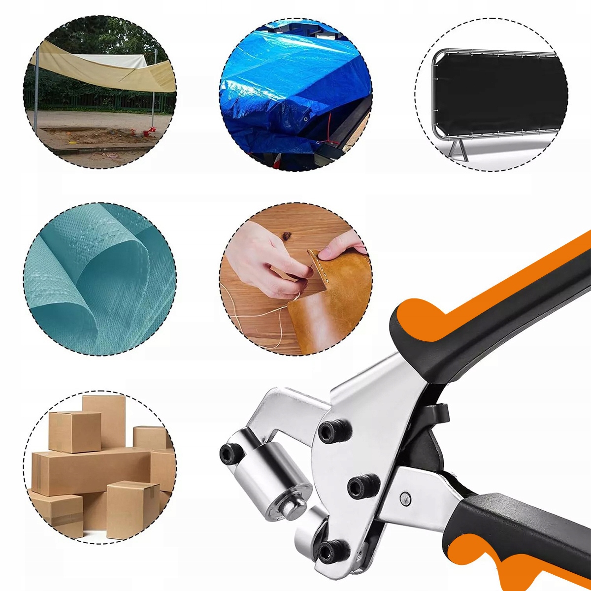 подходит для различных материалов, таких как водонепроницаемые резервуары, навесы, навесы, ткани, холст, баннеры PVV, кожа и т. Д. Примечание - материалы, которые являются слишком толстыми/мягкими, вы должны перфорировать перед сборкой!