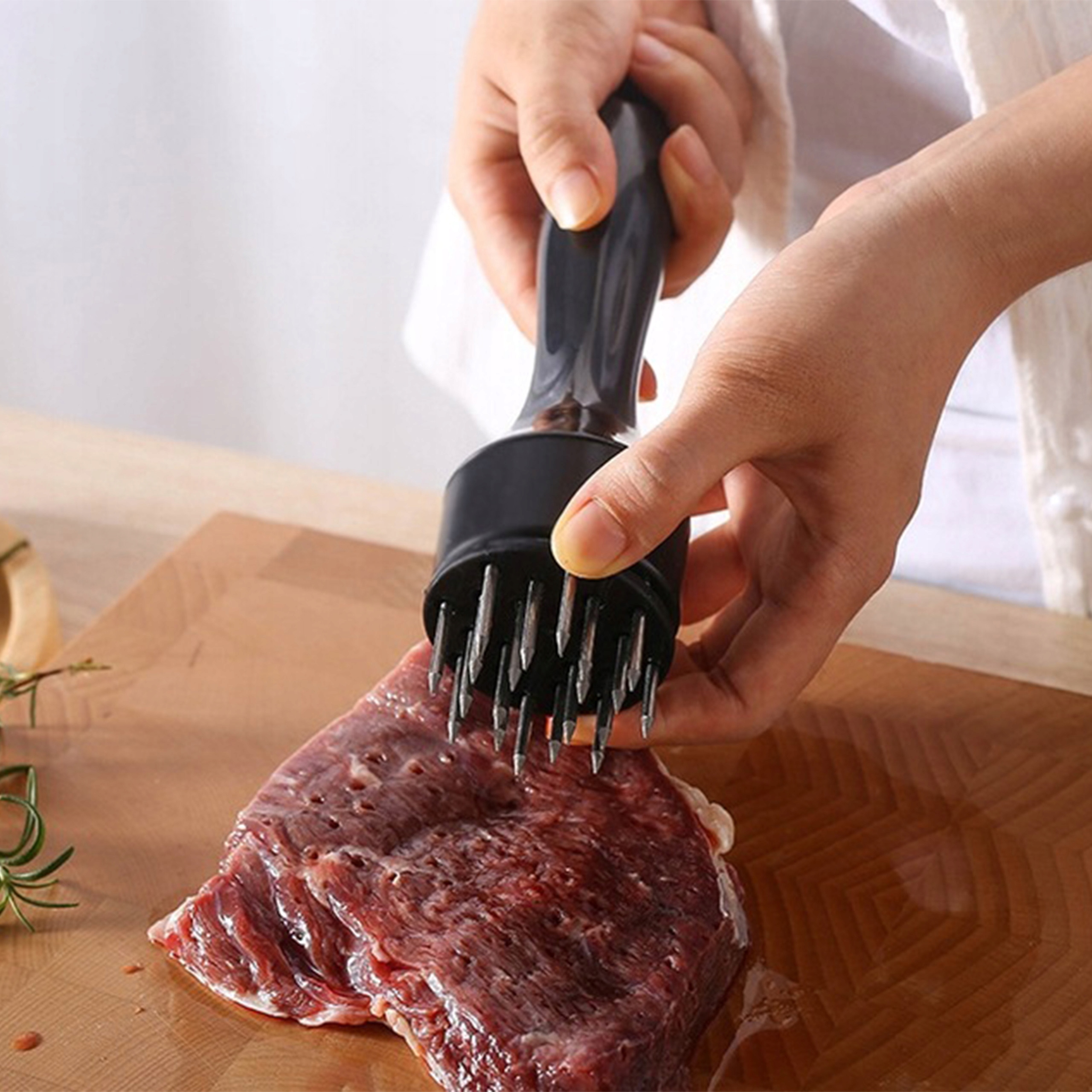 Прокалывающее устройство можно использовать перед маринованием мяса или непосредственно перед ним. жарка. Его можно использовать для любого вида мяса.
