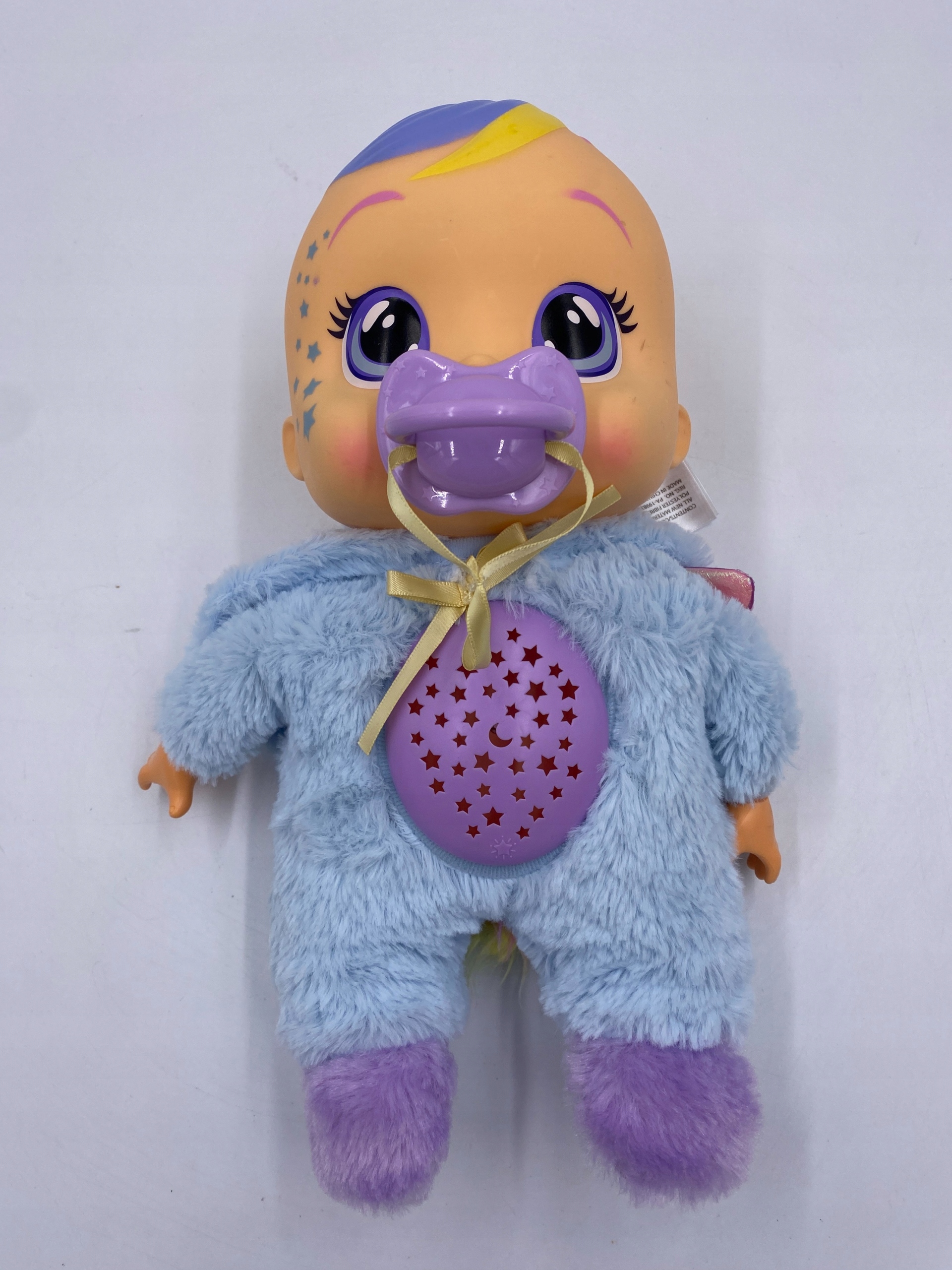 Новая куколка Cry Babies Goodnight Jenna — очаровательная игрушка, которая доставит много радости вашему ребенку. Дженна издает реалистичные звуки плача и выделяет волшебные светодиодные слезы, что делает веселье еще более реалистичным. Благодаря возможности помещения соски в рот кукла перестает плакать, а мягкий комбинезон и очаровательные ушки, грива и крылья добавляют персонажу очарования. Дополнительно, нажав на живот куклы, в комнате загорится звездное небо, и вы сможете выбрать одну из 5 расслабляющих колыбельных продолжительностью до 10 минут. Музыка и свет автоматически отключаются через заданное время, обеспечивая удобство использования. Изделие произведено в Китае и для чистки рекомендуется чистить кнопку, расположенную на затылке куклы. Это идеальный подарок для каждого ребенка, подаривший ему часы веселья и волшебные моменты.