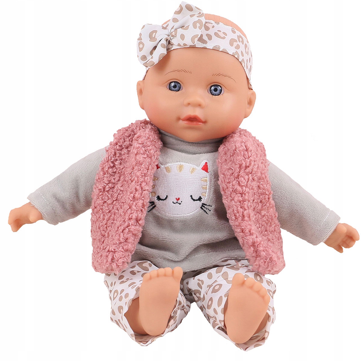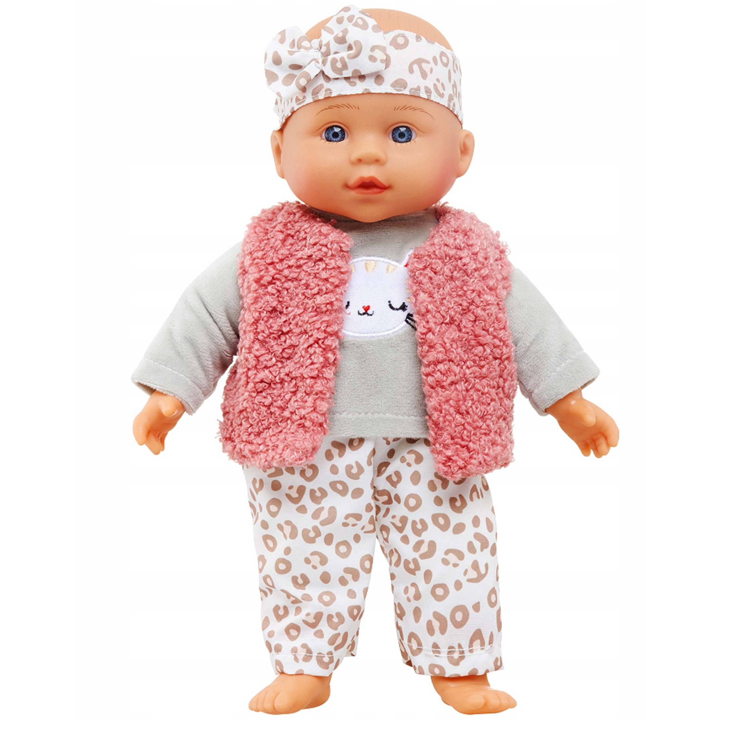 Кукла Юлька любит, когда о ней заботятся и берут с собой на прогулки. На мягкой кукле повязка на голову с бантом, бархатная блузка, брюки с леопардовым принтом и мягкий шерстяной жилет.