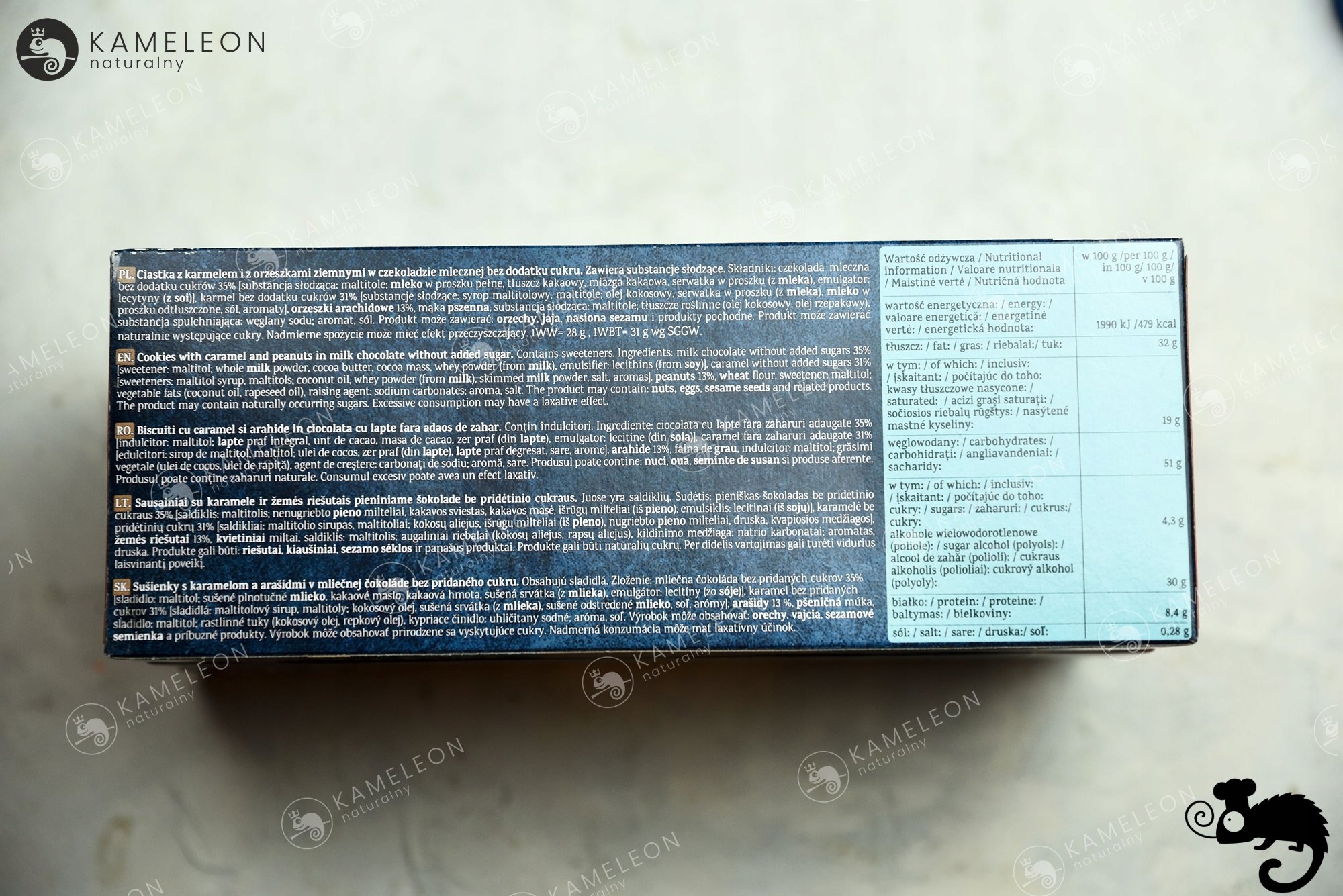 Состав: молочный шоколад без добавления сахара 35% [подсластитель: мальтит; сухое цельное молоко, какао-масло, какао тертое, сухая сыворотка (из молока), эмульгатор: лецитины (из сои)], карамель без добавления сахара 31% [подсластители: мальтитовый сироп, мальтиты; кокосовое масло, сухая сыворотка (из молока), сухое обезжиренное молоко, соль, ароматизаторы], арахис 13%, пшеничная мука, подсластитель: мальтитол; растительные жиры (кокосовое масло, рапсовое масло), разрыхлитель: карбонаты натрия; ароматизатор, соль. Продукт может содержать: орехи, яйца, семена кунжута и сопутствующие продукты. Продукт может содержать природные сахара.