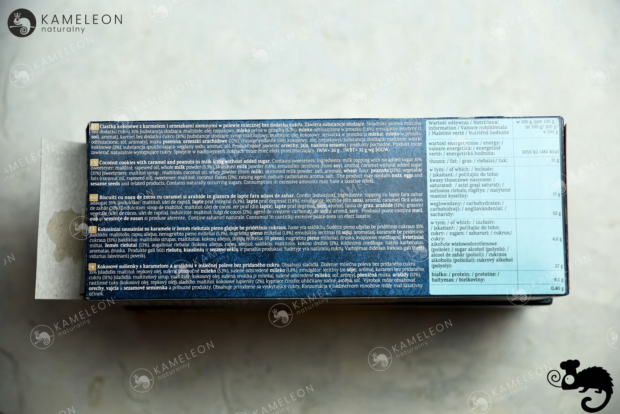 Ингредиенты: молочный топпинг без добавления сахара 35 % [подсластитель: мальтит; рапсовое масло, сухое цельное молоко (5,3%), сухое обезжиренное молоко (1,8%), эмульгатор: лецитины (из сои), ароматизатор], карамель без добавления сахара (31%) [подсластители: мальтитовый сироп, мальтиты; кокосовое масло, сухая сыворотка (из молока), сухое обезжиренное молоко, соль, ароматизаторы], пшеничная мука, арахис (12%), растительные жиры (кокосовое масло, рапсовое масло), подсластитель: мальтитол; кокосовая стружка (2%), разрыхлитель: карбонаты натрия; ароматизатор, соль. Продукт может содержать орехи, яйца, семена кунжута и сопутствующие продукты. Продукт может содержать природные сахара.
