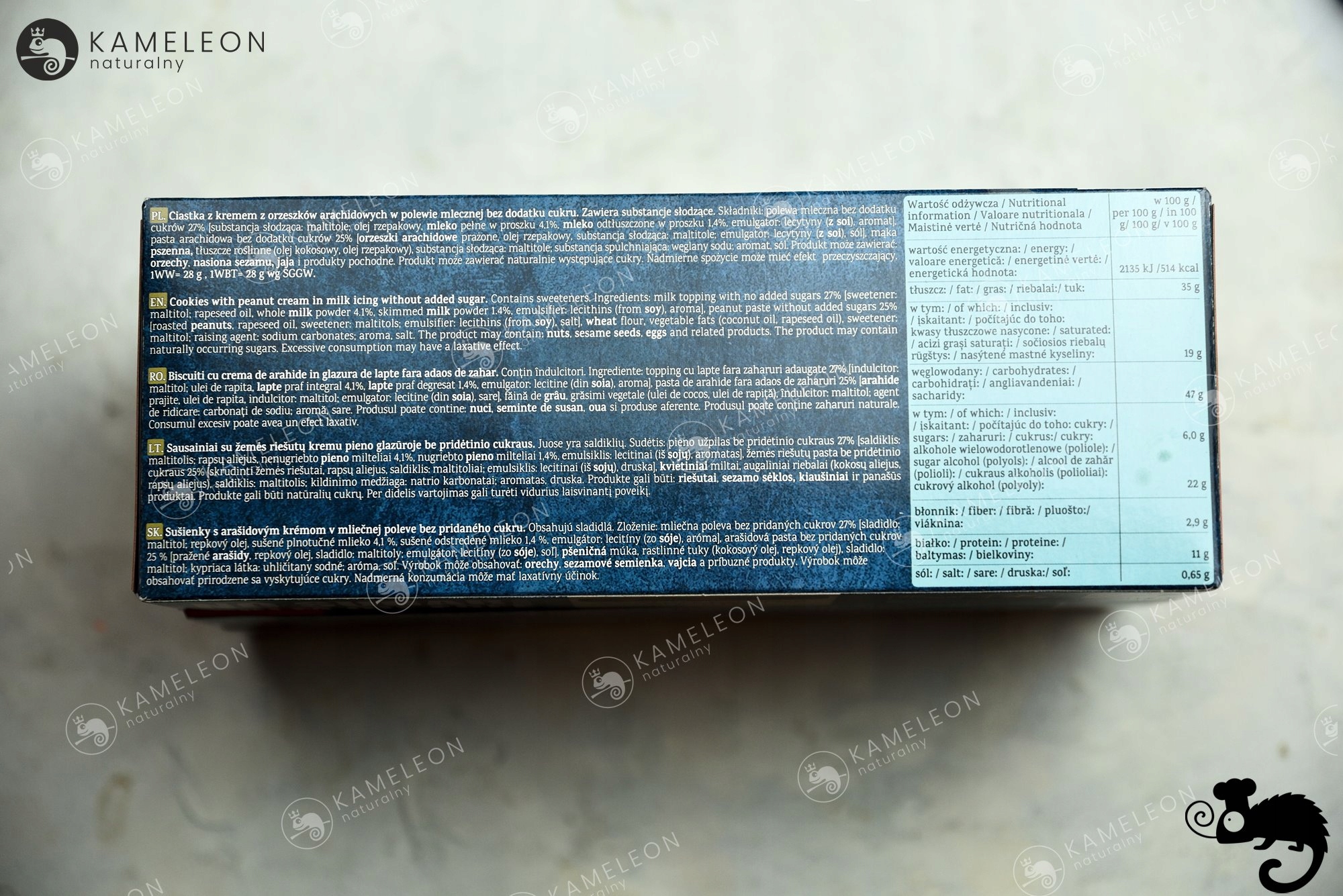 Состав: молочный топпинг без добавления сахара 27% [подсластитель: мальтит; рапсовое масло, сухое цельное молоко 4,1%, сухое обезжиренное молоко 1,4%, эмульгатор: лецитины (соевые), ароматизатор], арахисовая паста без добавления сахара 25% [арахис жареный, масло рапсовое, подсластитель: мальтиты; эмульгатор: лецитины (соевые), соль], пшеничная мука, растительные жиры (кокосовое масло, рапсовое масло), подсластитель: мальтитол; разрыхлитель: карбонаты натрия; ароматизатор, соль. Продукт может содержать: орехи, семена кунжута, яйца и их производные. Продукт может содержать сахара природного происхождения.