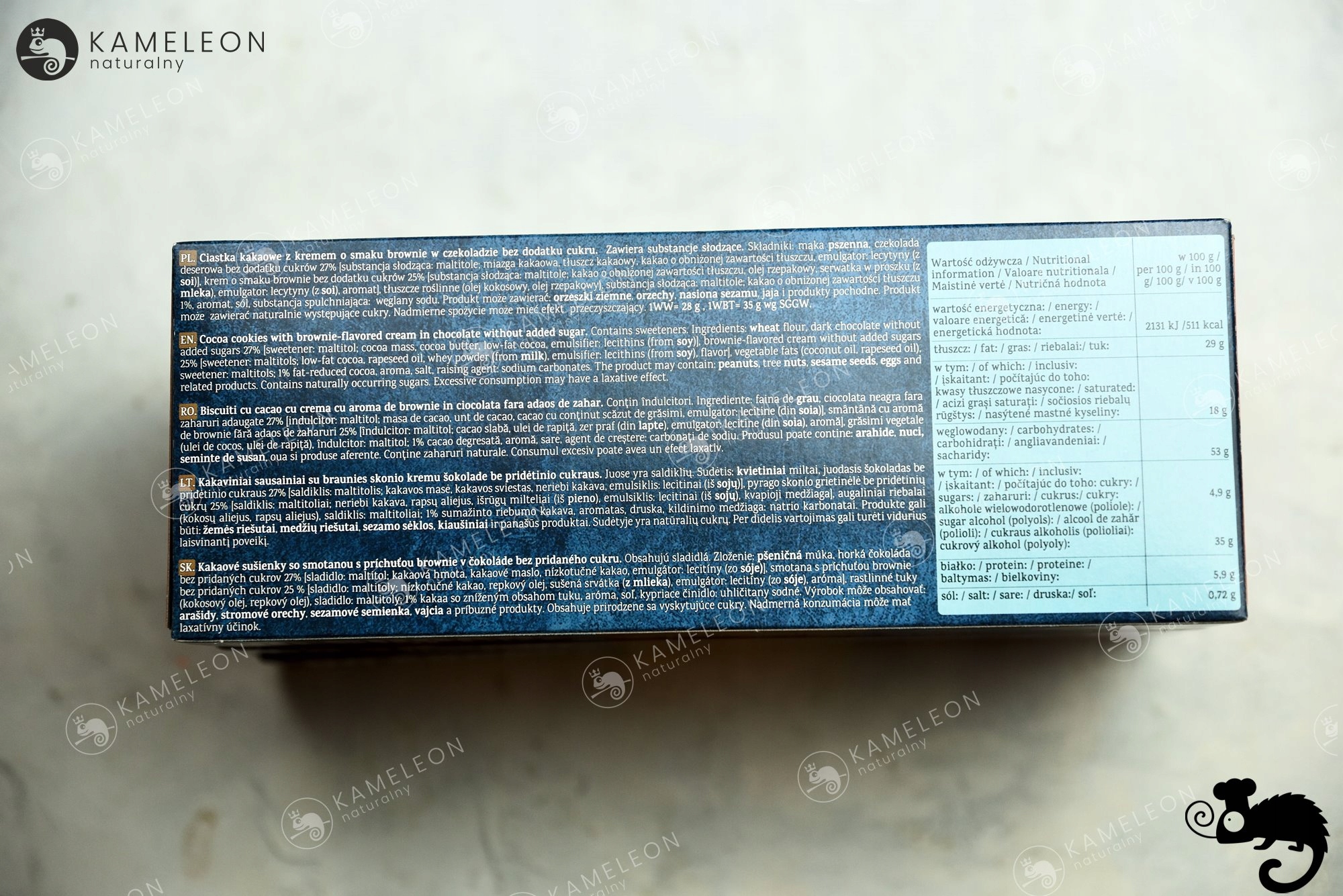 Какао-печенье со вкусом брауни в темном шоколаде, без добавления сахара и пальмы масло.