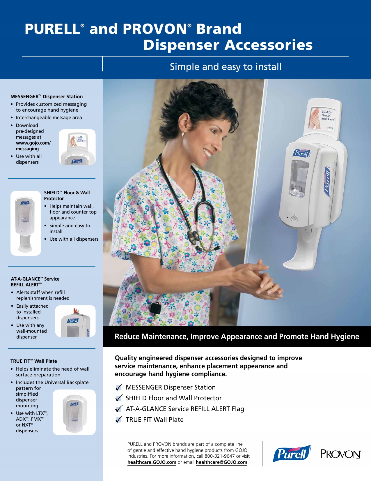Простота в установке станция сообщений, которая крепится к верхней части любого дозатора ADX™ или LTX™. Простой способ обеспечить хорошую гигиену рук. Требуется использование настенной пластины GOJO® TRUE FIT™.