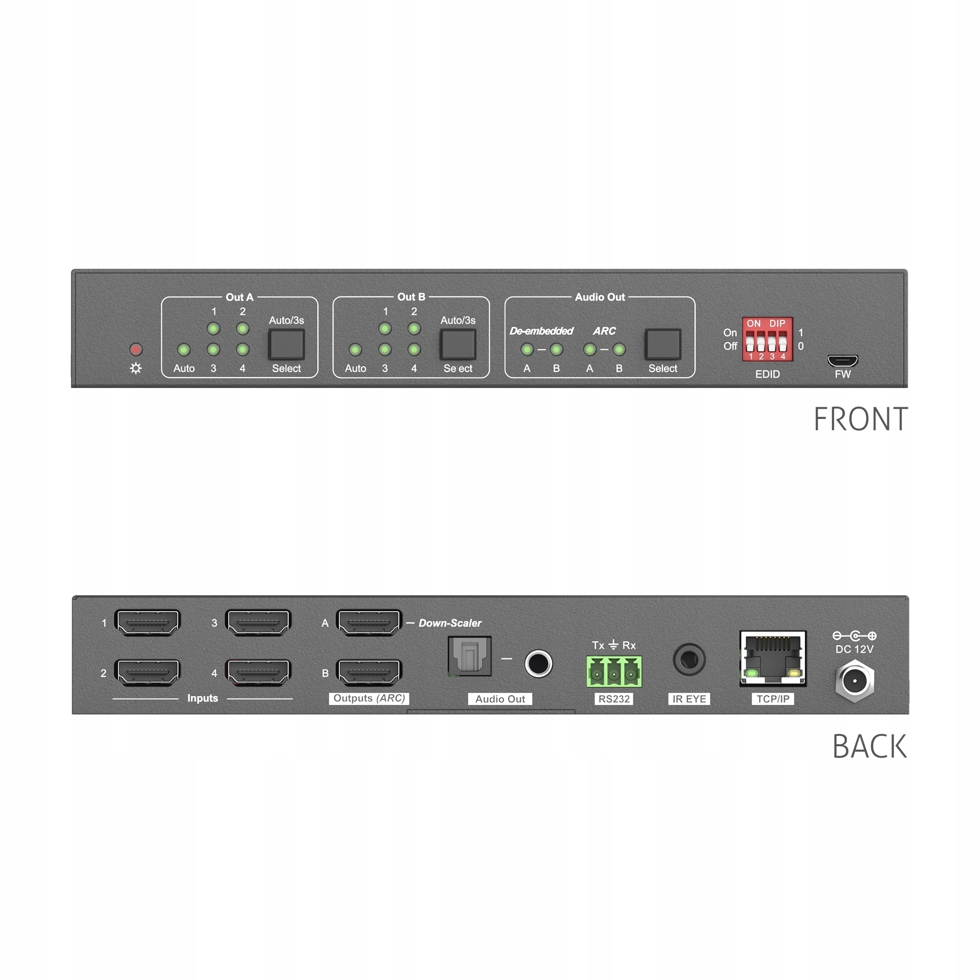 PT-MA-HD44-UHD Матричный переключатель HDMI 4x2 от PureTools серия представляет собой профессиональное решение для домашнего кинотеатра, распределения видеосигнала и цифровых рекламных приложений, совместимое с новейшими источниками UltraHD и дисплеями, отображающими сигналы с разрешением до 4K (60 Гц 4:4:4) с поддержкой HDR и полосой пропускания 18 Гбит/с. . Выходы HDMI также имеют функцию уменьшения разрешения с 4K до 1080p. PT-MA-HD42UHD обеспечивает большую гибкость управления через Интернет, RS232 и ИК, а также интеллектуальное управление EDID.