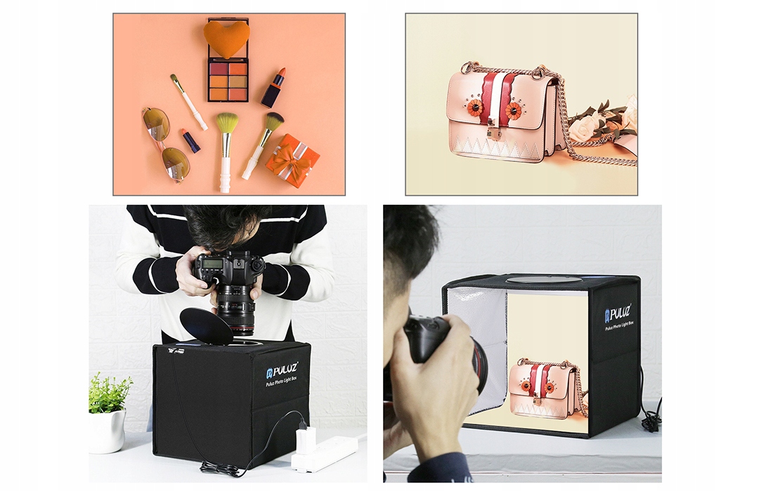 Безэкварная палатка была создана для любителей фотографии, онлайн -продавцов, профессионалов и рекламодателей. PU5025B позволит вам создавать фото Ministudio в вашем доме. Благодаря палатке вы можете сфотографировать мелкие предметы, такие как ювелирные изделия, игрушки, часы и т. Д. Вы можете положить его на любую поверхность. PU5025B -идеальный фон для фотографий, набор включает в себя 6 двойных прокладков в до 12 цветов. Кроме того, портативная складная структура позволяет легко устанавливать и хранить.