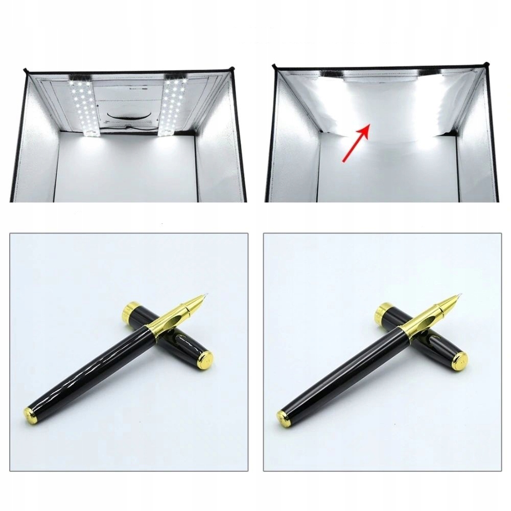 Две полосы с светодиодами с мощностью 1200 лм были установлены на внутренних стенах палатки. Целое питается от источника питания, прикрепленного к набору. Использование палатки во время рабочих гарантий, получая равномерно освещенные, безмолковые фотографии.