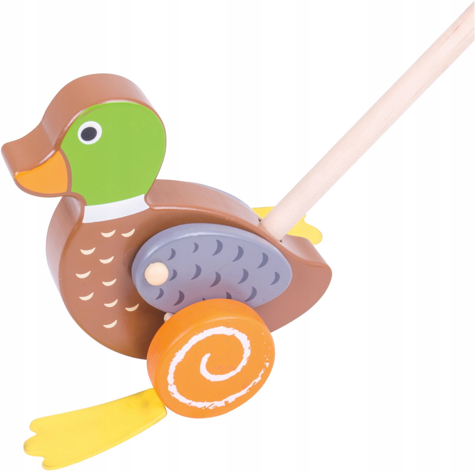 Игрушка цельно сделана из фанеры и массивного дерева, эстетично окрашены безопасными красками. Рядом с колесами у утки есть ярко-желтые резиновые лапы, которые забавно хлопают при движении. Толкатель соответствует европейским стандартам безопасности.